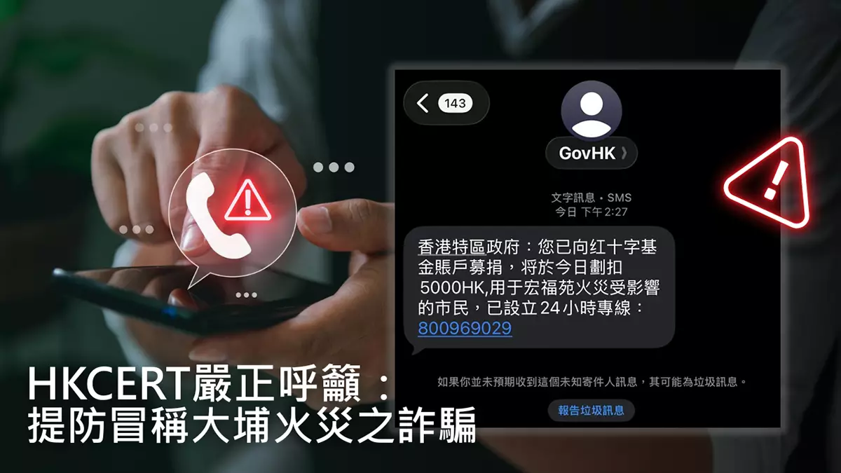大埔宏福苑5級火災牽動人心,社會各界紛紛捐款以支援救災及援助工作。然而騙徒繼續利用火災名義進行詐騙,先以「GovHK」名義發送短訊,聲稱受災捐款已自動扣款,並引用「紅十字基金」及「宏福苑火災」增加可信度,並附上九位數字電話號碼,以便受害人後續聯絡客服人員查詢。香港網絡安全事故協調中心(HKCERT)密切留意有關的網絡詐騙事件,並會一如既往地在技術上全力支援執法部門的調查工作,包括協助移除有關虛假網站的超連結等;警方亦指出「防騙視伏器」已將相關電話號碼列為「高危有伏」。HKCERT再次呼籲市民接獲可疑電話或訊息時應提高警覺,切勿輕信。