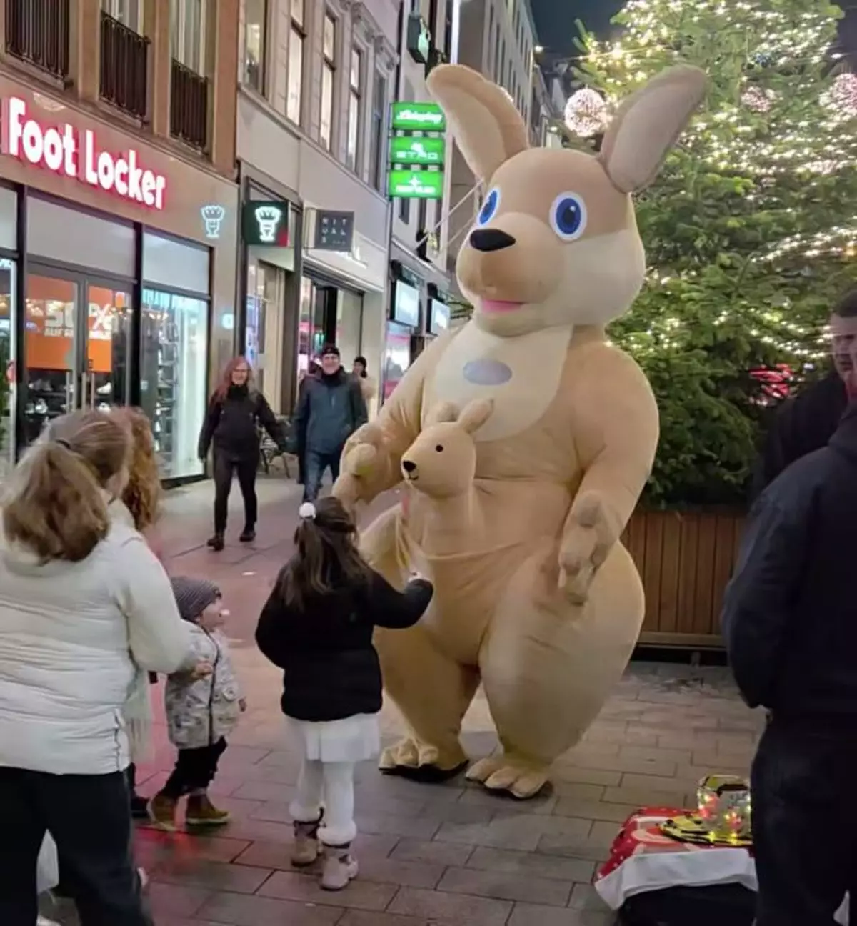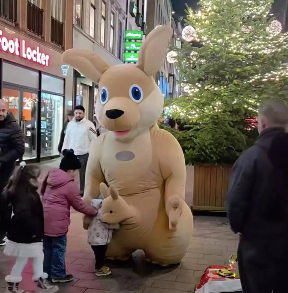 德國聖誕市集一名街頭藝人穿著巨型袋鼠公仔服裝,「小袋鼠可伸縮」的獨特設計動作引網民爆笑熱議。