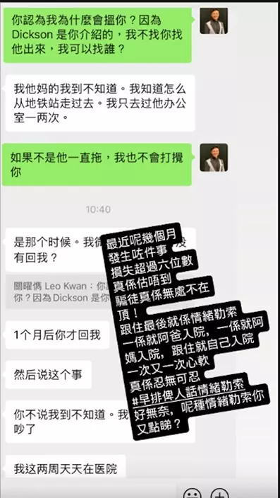 然而,關曜儁近日於IG Story自爆不幸遇上騙徒,損失超過六位數。他雖未詳細交代被騙經過,但從他上載的對話截圖可見,他急於尋找一名名為「Dickson」的人,而向他回覆的正是曾把「Dickson」介紹給他的中間人。截圖顯示,該中間人不斷推搪,以各種藉口拖延,令關曜儁忍無可忍,情緒爆發。