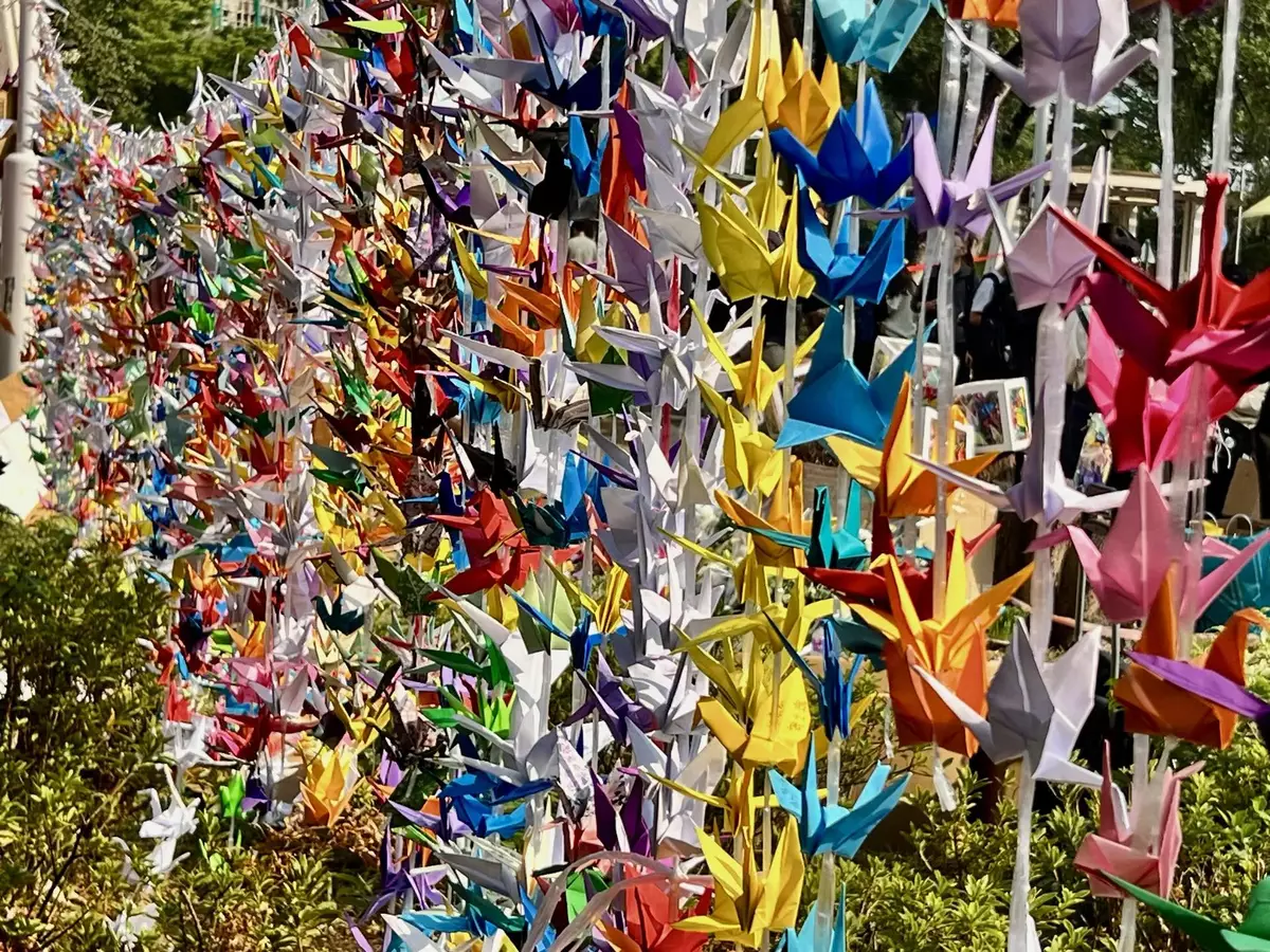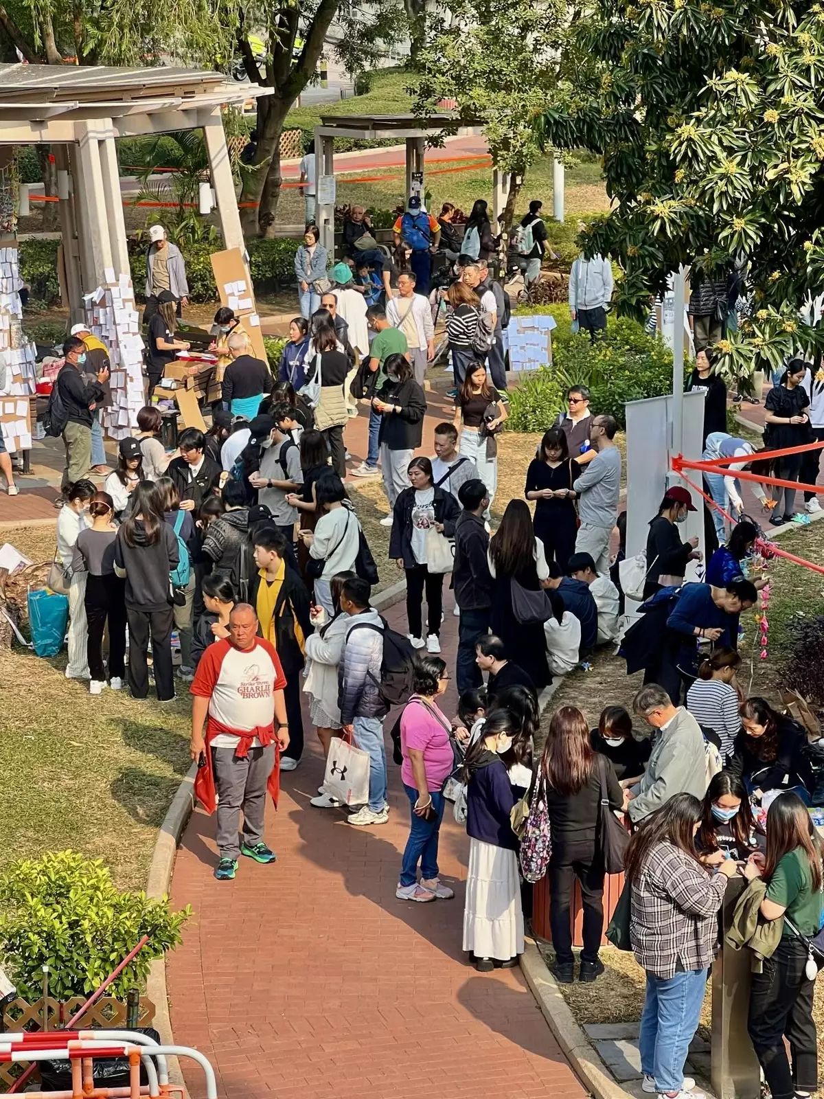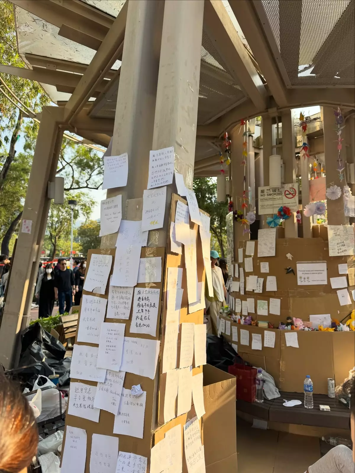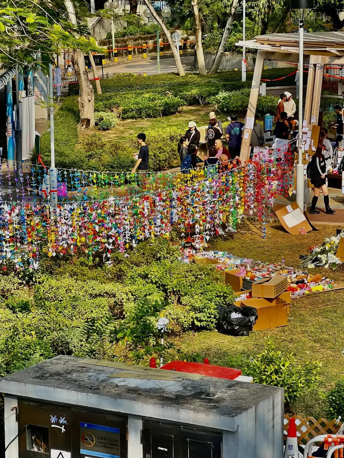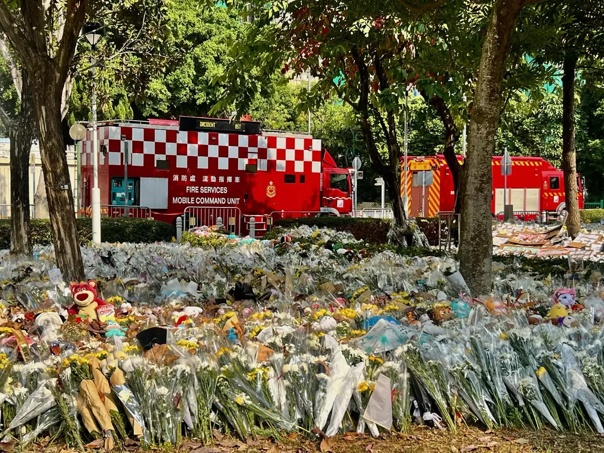 大埔宏福苑大火發生至今個多星期,大批市民繼續到附近廣福休憩處獻花和摺紙鶴悼念。