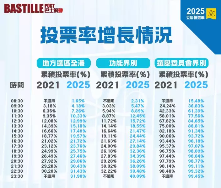 立法會換屆選舉12月7日舉行,投票已於當晚11時半結束。地方選區總投票率為31.9%,較上屆總投票率30.2%高出1.7個百分點。