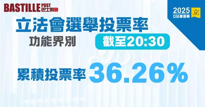 截至20:30,地方選區的累積投票人數為1,200,490,累積投票率為29.06%。功能界別的累積投票人數為69,587,累積投票率為36.26%。選舉委員會界別的累積投票人數為1,448,累積投票率為98.77%。