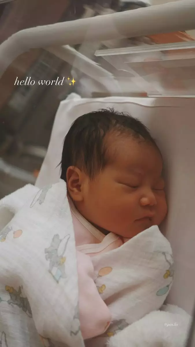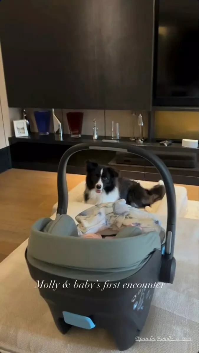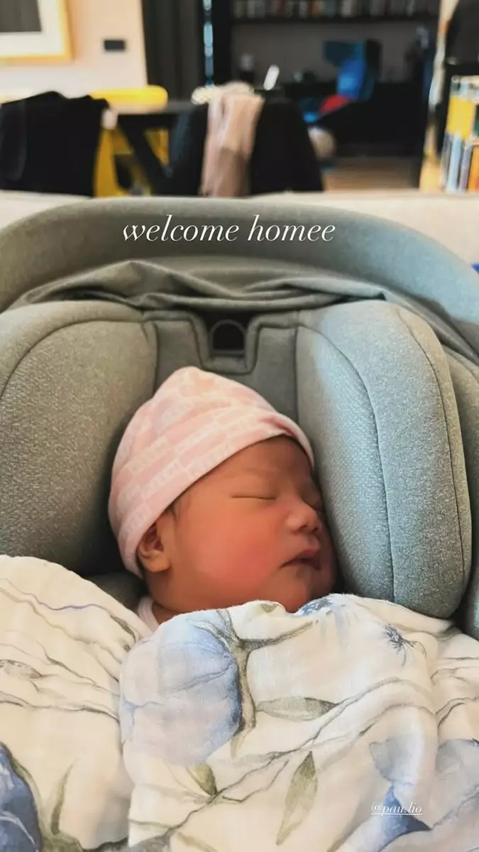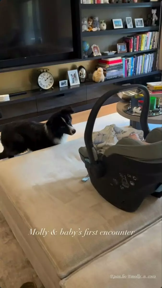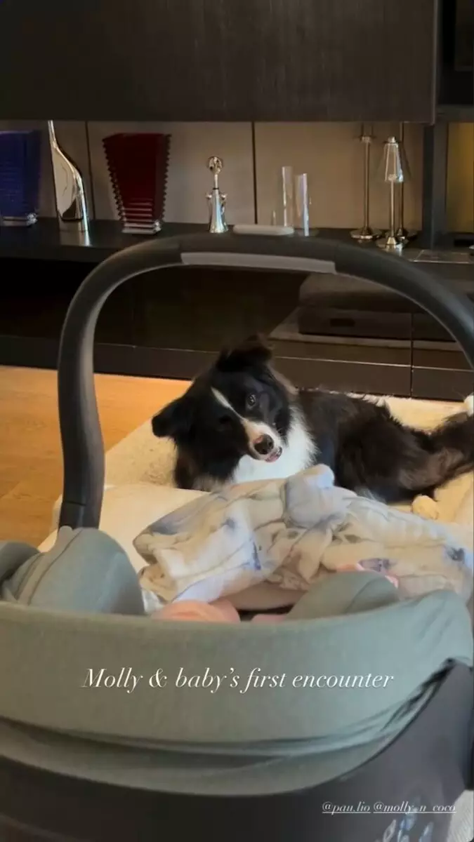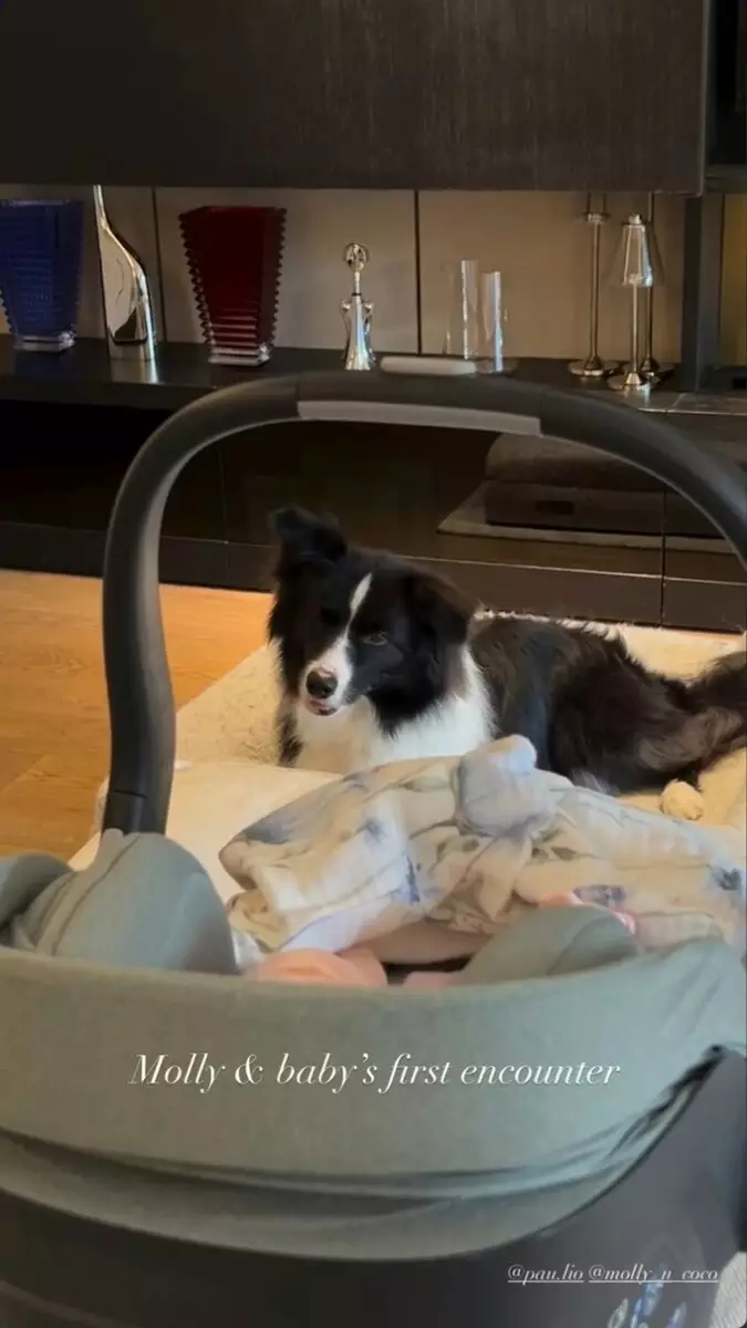 丁子田在IG Story晒出囡囡的正面照,並留言:「hello world」,可見正在熟睡的B女,臉圓圓,十分可愛!丁子田之後又晒出囡囡回到家中的照片,並寫道:「welcome homee」,她還拍片記錄愛犬Molly首次見到B女的反應,可見Molly相當安靜,只圍繞着梳化上的BB籃看,期間又不時側頭,似乎都對這位新成員十分好奇,畫面可愛又溫馨!