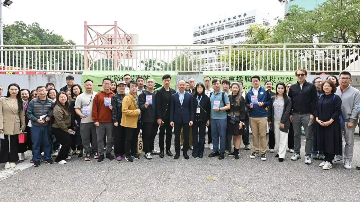 政制及內地事務局局長曾國衞巡視位於香港道教聯合會鄧顯紀念中學及東華三院甲寅年總理中學的鄰近邊境投票站,其間與一批已登記在該處投票的選民合照。