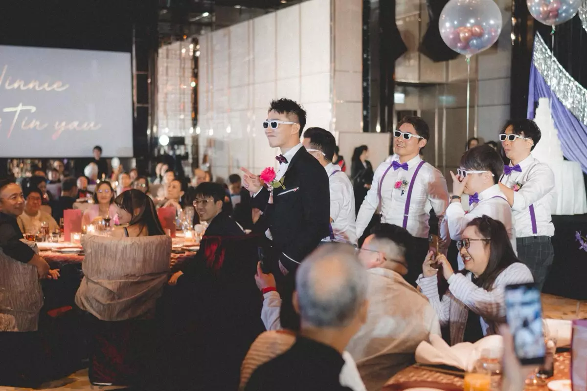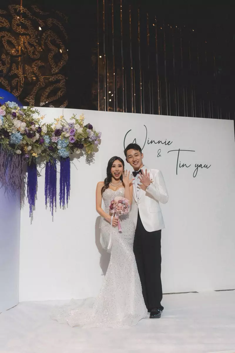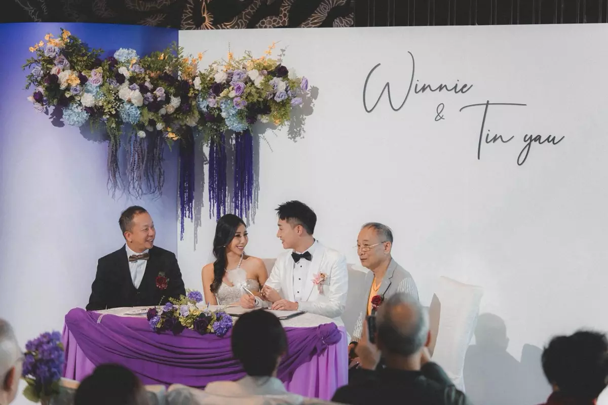 證婚及晚宴於酒店Diamond Ballroom延開23席,天佑邀請了多位圈中台前幕後好友出席婚宴。宴會開始前新人及兄弟姊妹以熱鬧跳舞形式進場,兄弟陳俊堅用兩星期為大家排舞,效果非常成功。在致辭時,天佑表示爸爸數月前中過兩次風,感恩而家爸爸在康復中,所以感受到珍惜當下既重要,祝願大家身體健康生活愉快。