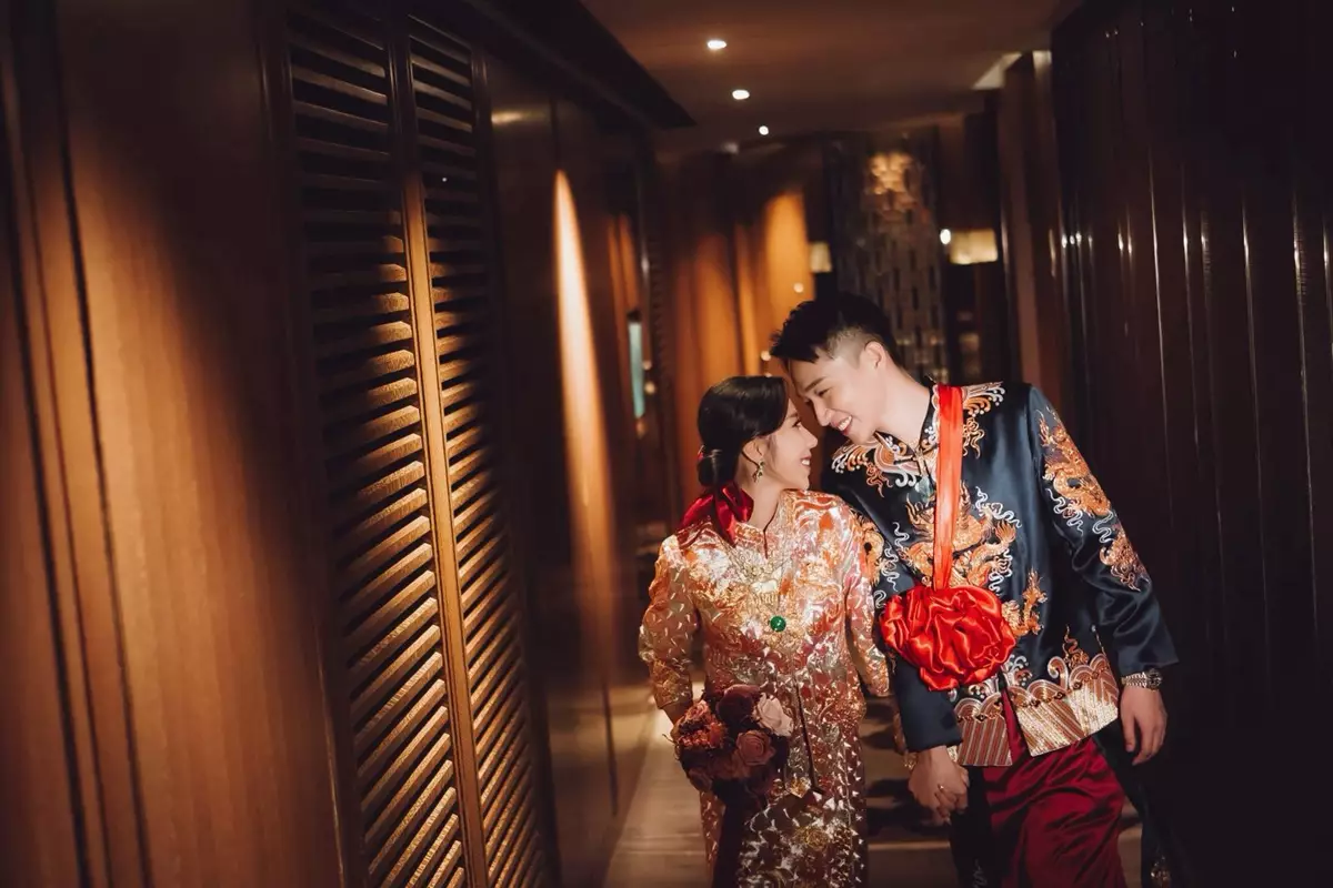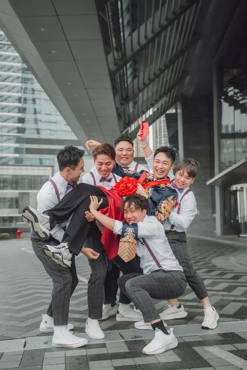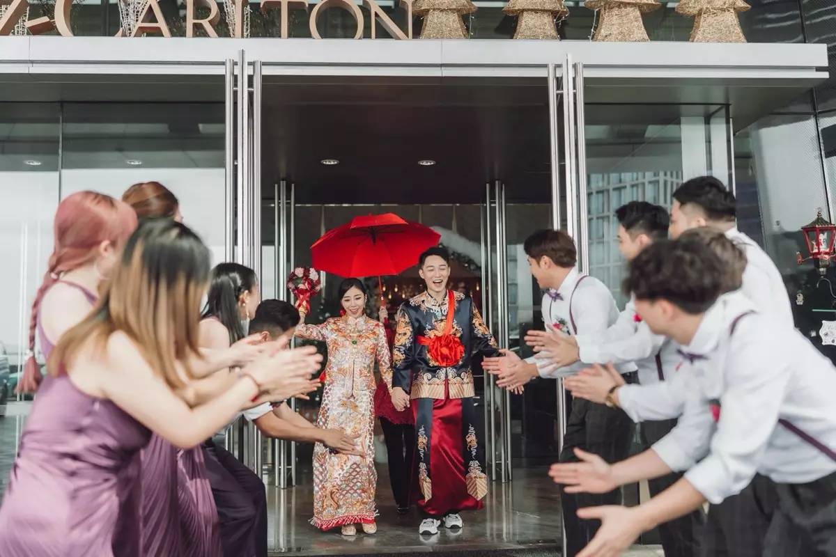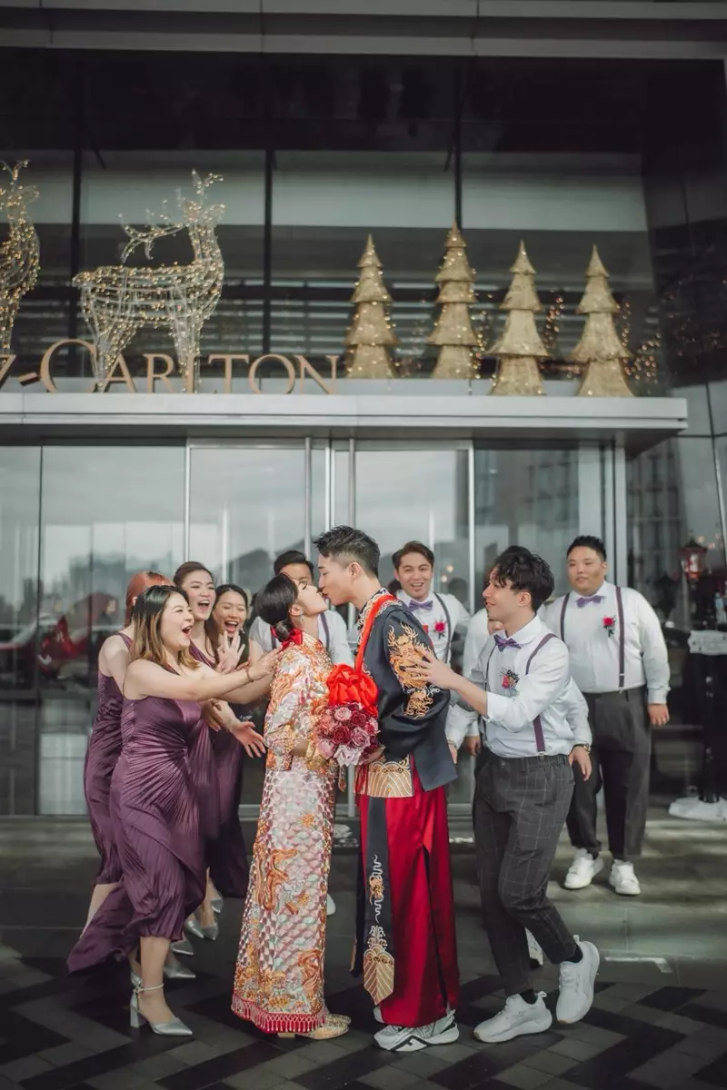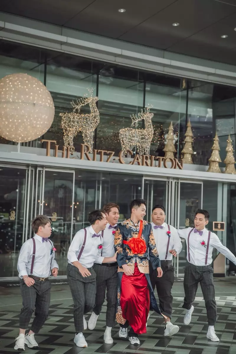婚禮當日,新郎天佑與眾兄弟包括鄒兆霆及陳俊堅,早上去到接新娘及進行敬茶儀式。天佑穿著藏藍色調金龍馬褂,當中新娘穿著金龍彩鳳粉紅鑽褂皇外,還全身都是金器,當中還戴上巨型流星錘龍鳳鈪,份量十足!