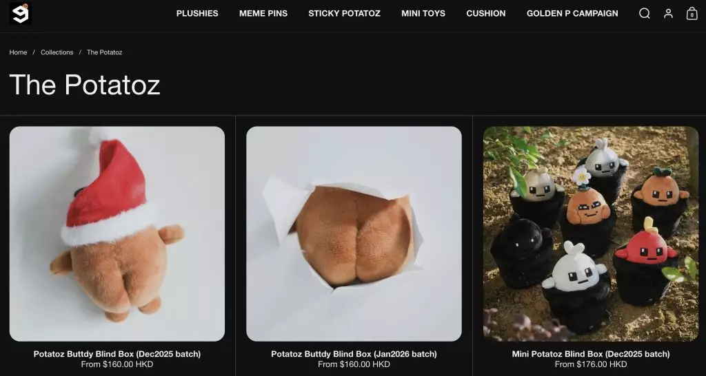 如今,9GAG將其從線上帶到線下,帶來一系列「Potatoz」精品,包括毛公仔、咕𠱸、襟章及貼紙等;其中盲盒毛公仔共有兩個系列,Potatoz Buttdy Blind Box系列有五款,包括聖誕老薯、星星薯、搖滾薯、偷心薯及斗篷薯;另一系列Mini Potatoz Blind Box,就將「Potatoz」放在植物盆中,這系列共有六款加一款隱藏版。