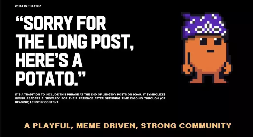「Potatoz」的創作靈感源於9GAG社群的一個有趣傳統。當用戶發布長篇內容時,通常會在文末附上一句「Sorry for the long post, here’s a Potato 」,並附上一個薯仔圖案,作為對耐心閱讀者的一個幽默獎勵。這種獨特的社群共識,後來就被9GAG創作團隊轉化成可愛的Pixel Art角色。