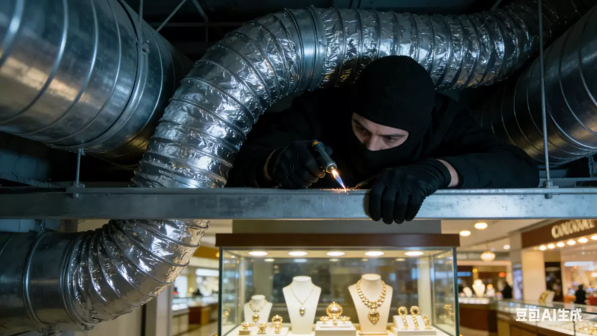 男子潛伏通風管道9小時盜走珠寶店140萬(人民幣)珠寶。AI生成圖片