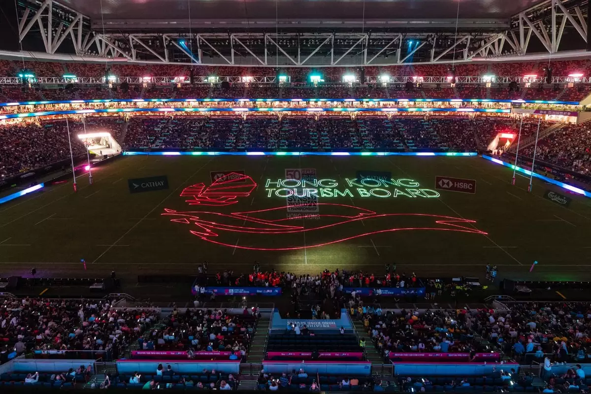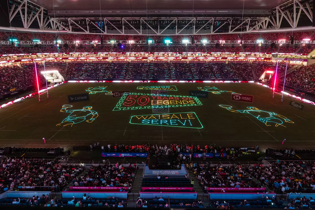 緊接其後,主場館大草坪上演激光表演,呈現歷年參賽國家、七欖傳奇球星姓名,以及雙龍在香港飛舞的視覺效果,象徵七欖50年發展。至於周日舉行的閉幕禮,球場天幕將發射煙火,為一連三天的賽事畫上句號。
