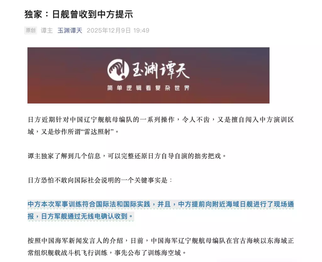 帖文提到,遼寧艦航母編隊當日下午發現兩架日本F-15飛機飛入中方提前告知的演訓海空域,最近距離中方飛機不足50公里,目前全球部分主流戰機的機載雷達對空探測距離都大於50公里,意味日方的行為嚴重干擾中方的正常訓練秩序,將雙方置於危險境地,日方既然惡意進入中方演習區域,自動進入雷達搜尋範圍,自然可以感知到雷達搜尋信號。