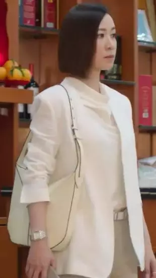 除了鬆馳有度的與經典,姐在劇中亦以手袋亮相。這款手袋以雕塑感的弧形輪廓為設計核心,搭配黑色烤漆袋邊,為沉穩造型注入建築式美學的精緻細節。其貼合肩線的摺疊結構能自然貼身垂落,不僅提升日常通勤的舒適感,更展現一種不張揚、自然優雅的專業姿態。