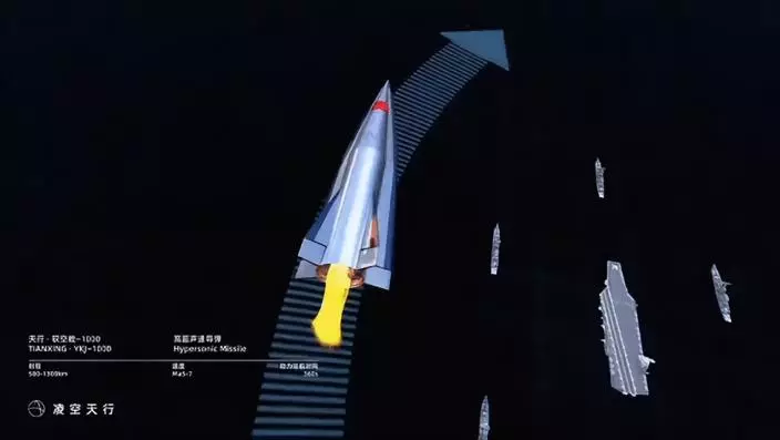 除此之外,該導彈還通過在滑翔飛行器當中安裝小型發動機的方式,實現了二次加速和機動的功能。這種設計是具有創新性的,安裝小型發動機後,導彈在飛行過程中能夠根據實際情況進行再次加速,同時還能靈活地改變飛行軌跡。這一舉措進一步增強了該導彈的反攔截性能,使得敵方的防空系統更難以對其進行攔截。而且,它還大大提升了導彈的末端機動性,讓導彈在接近目標時能夠更加精準地調整飛行姿態。正是因為有了這樣的性能提升,馭空戟-1000高超音速導彈具備了對陸地或者海上移動目標,例如航母編隊等進行精確打擊的能力。值得注意的是,在該公司發佈的馭空戟-1000導彈CG視頻中,模擬了該導彈對日本本土以及美日聯合航母編隊進行飽和打擊的場景。這不僅彰顯了導彈的射程優勢——能夠從中國本土覆蓋「第一島鏈」,還體現了其對移動目標的精確打擊能力。
