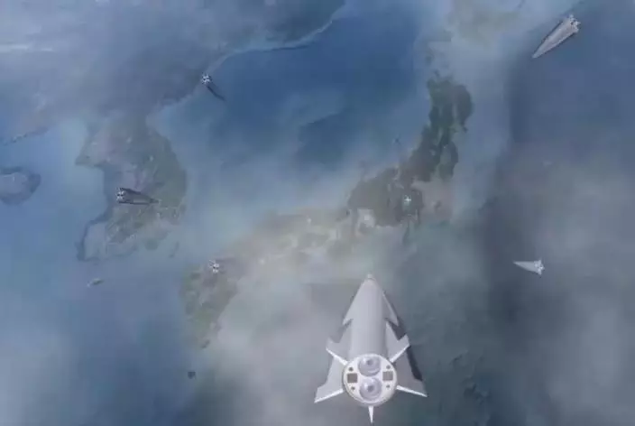 導彈飛越日本列島上空的攻擊模擬場景,用於展示其覆蓋第一島鏈的射程範圍