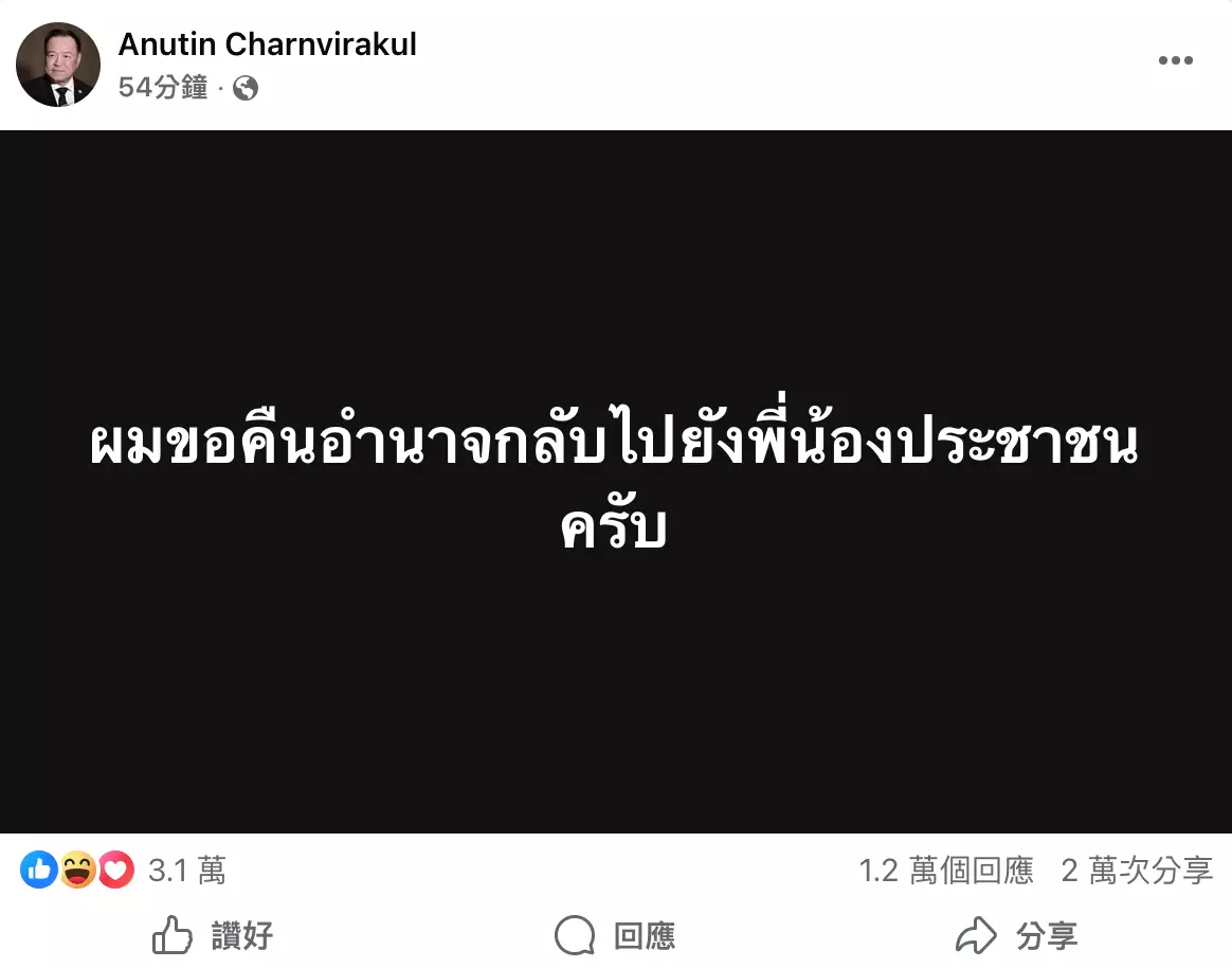 泰國總理阿努廷在社交媒體發聲明說,請求將權力歸還人民。新華社引述泰國傳媒報道,有關聲明意味阿努廷已向國王哇集拉隆功申請解散國會下議院,以便提前舉行大選。
