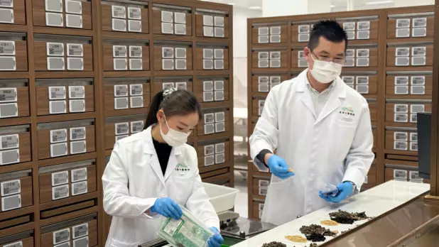 卞兆祥解釋在配藥過程中,中醫師處方藥物後,藥房要核實處方,配藥後要交由另一員工核對。(港台圖片).