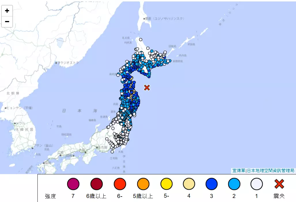 共同社報道,地震在當地上午11時44分發生,震央位於青森縣附近海域,震源深度20公里,初步估計強度是6.7級。