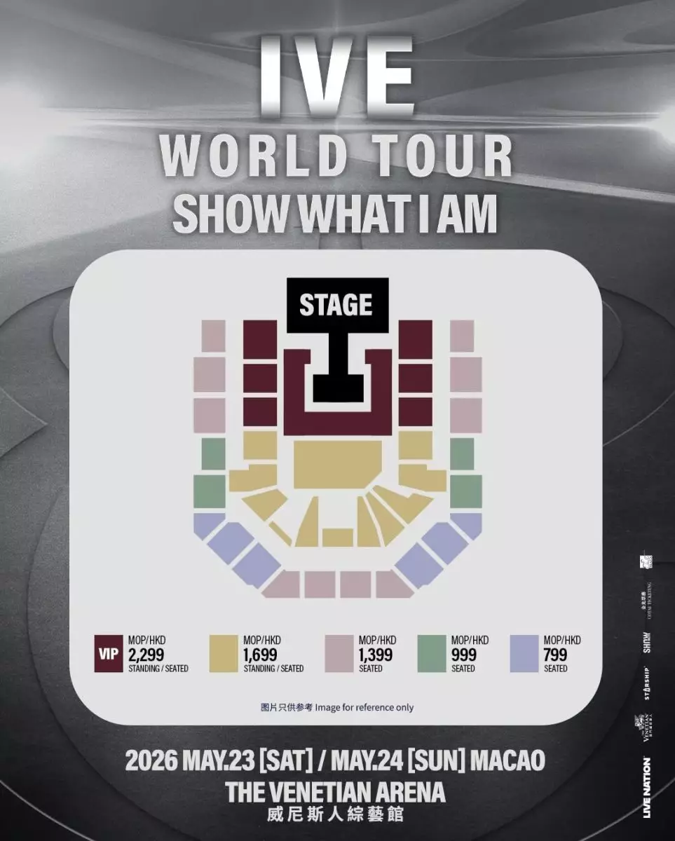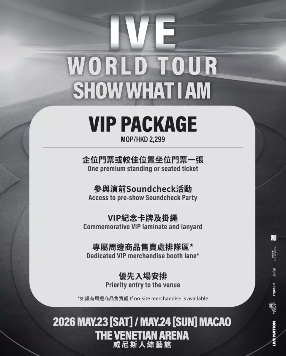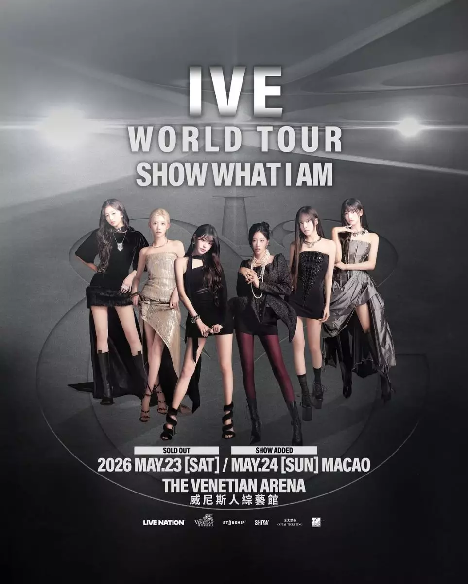 韓國人氣團體 IVE 早前宣佈即將在2026 年 5 月 23 日(星期六)於澳門威尼斯人綜藝館盛大舉行第二次世界巡迴演出《IVE WORLD TOUR <SHOW WHAT I AM> 》。門票在12月11日公開發售後,主辦單位宣佈門票火速售罄,決定加開2026年5月24日(星期日)一場,門票在12月12日中午十二時公開發售後亦已火速售罄。