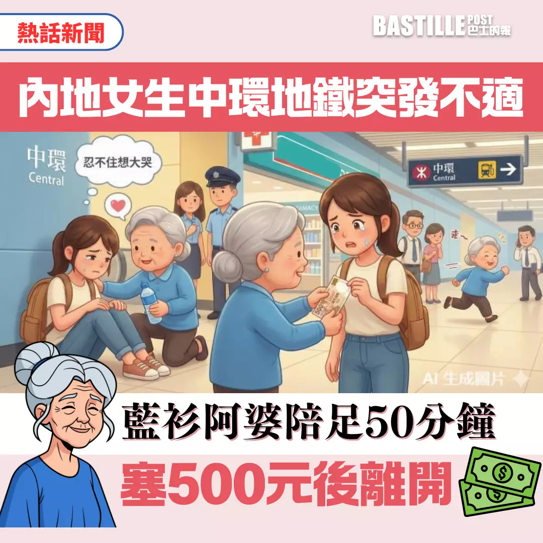一名內地女生在中環港鐵站突發不適,一位藍衫阿婆即場陪伴近50分鐘,遞水照顧。AI 生成圖片