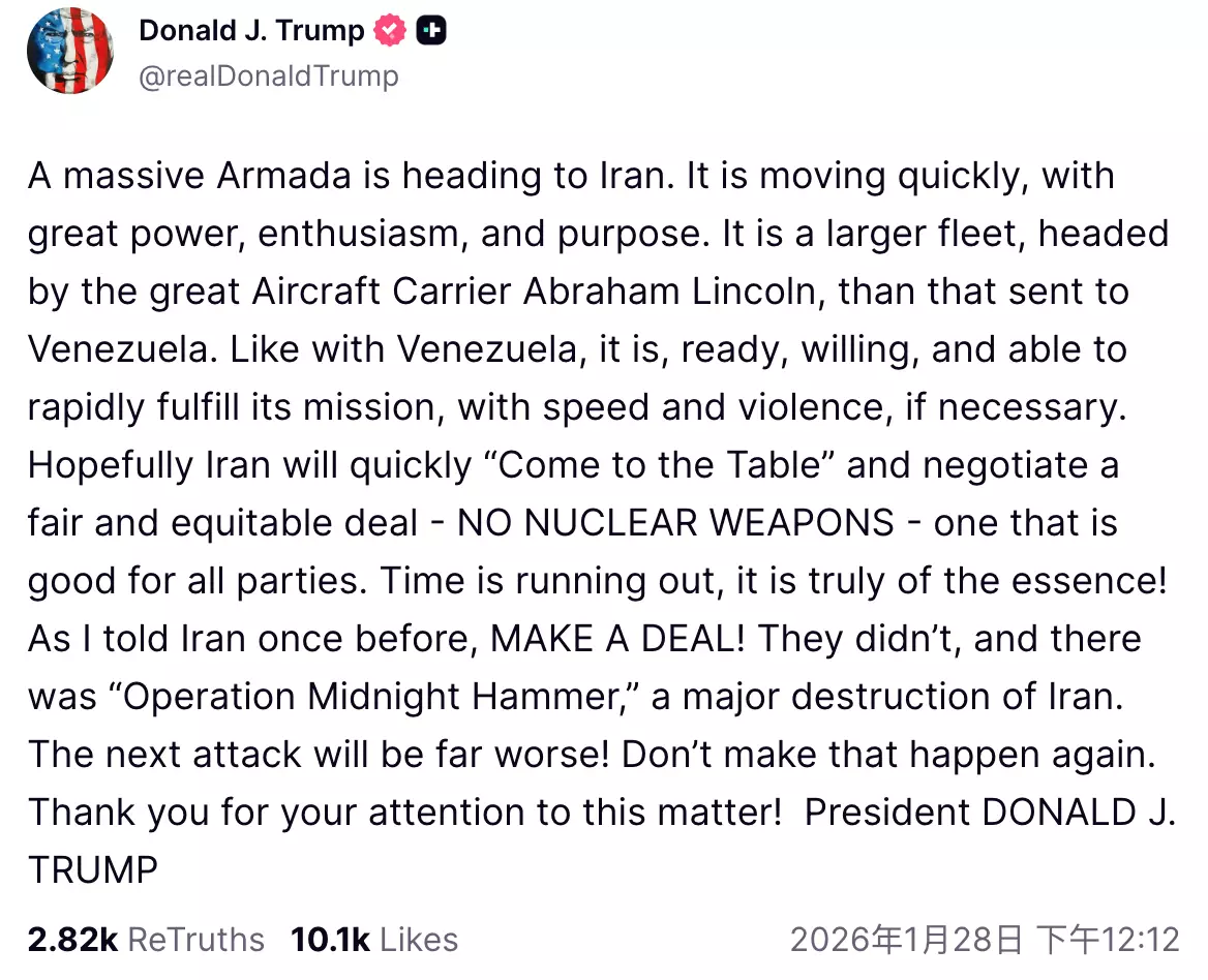 美國總統特朗普在旗下社交平台上說,一支龐大的艦隊正前往伊朗,已準備好迅速履行使命。他表示,希望伊朗能夠迅速坐到談判桌前。