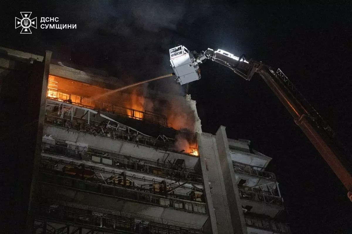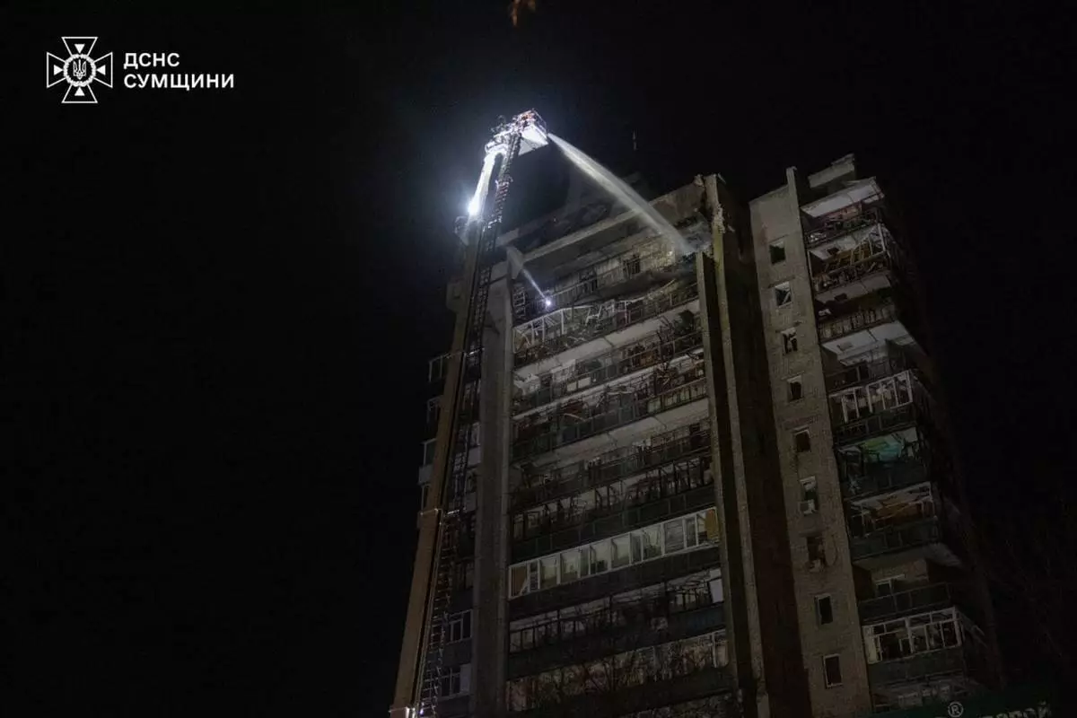 2026年4月4日,烏克蘭國家緊急服務局提供的照片顯示,救援人員在烏克蘭蘇梅市(Sumy)撲滅一幢住宅大樓的火災,該大樓在俄羅斯襲擊後受損。(美聯社圖片/Ukrainian Emergency Service) AP圖片
