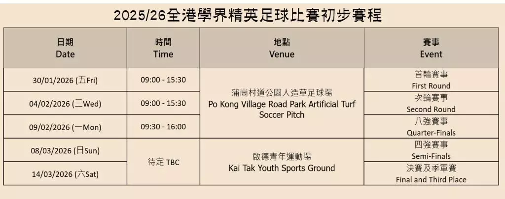 2025/26全港學界精英足球比賽初步賽程如下: