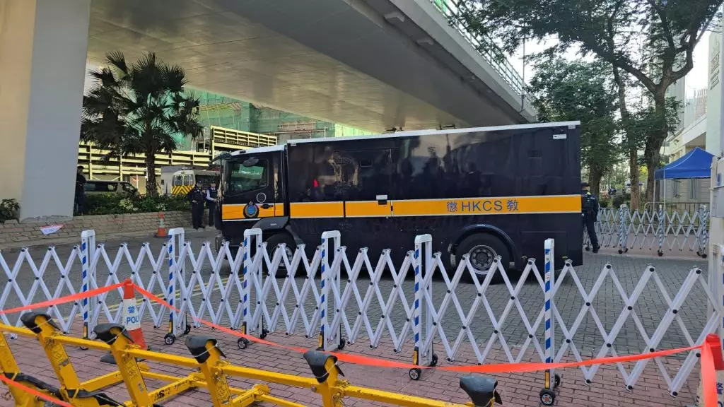 警方在法院一帶加強戒備, 多名警員在法院外駐守,出動「劍齒虎」裝甲車及多輛警車。巴士的報記者攝
