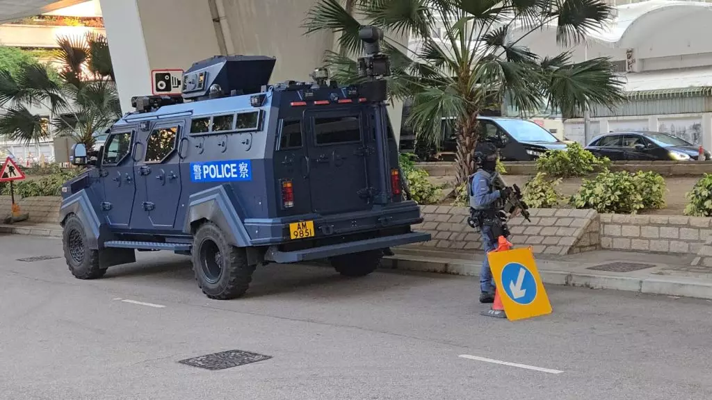 案件在西九龍裁判法院宣判,此案備受本港及國際社會關注,警方在法院一帶加強戒備,「劍齒虎」裝甲車及多輛警車到場,反恐特勤隊、爆炸品處理課、警犬隊、傳媒聯絡隊等聯同大批荷槍實彈警員在法院外駐守,確保裁決安全及順利進行。
