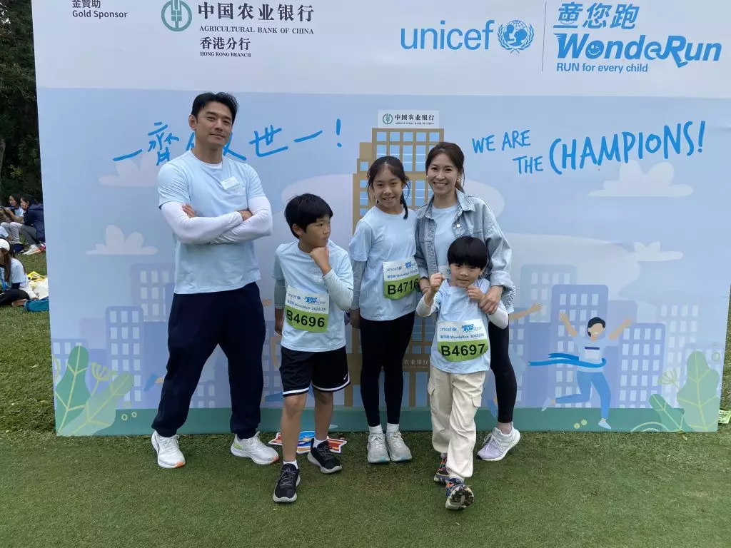 黃長興(左起)與次子Tristan長女Paige、和孻仔Damien及太太Peggy一同出席UNICEF慈善跑「童您跑」。