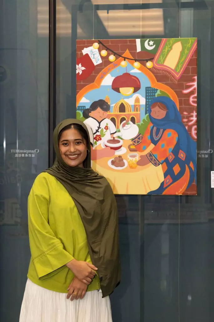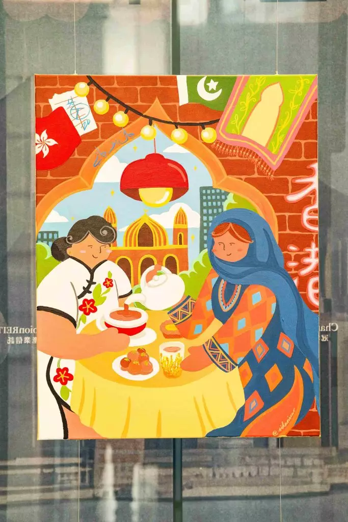 於香港出生及長大的Rida修讀視覺藝術、景觀建築及劇場設計,她志在成為多才多藝的藝術家。受巴基斯坦 - 中國混血根源啟發,Rida融合鮮豔色彩、大膽形狀與民族圖案,此畫描繪巴基斯坦與中國女子茶聚,展現開放與文化交流。