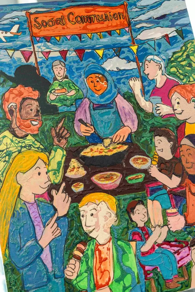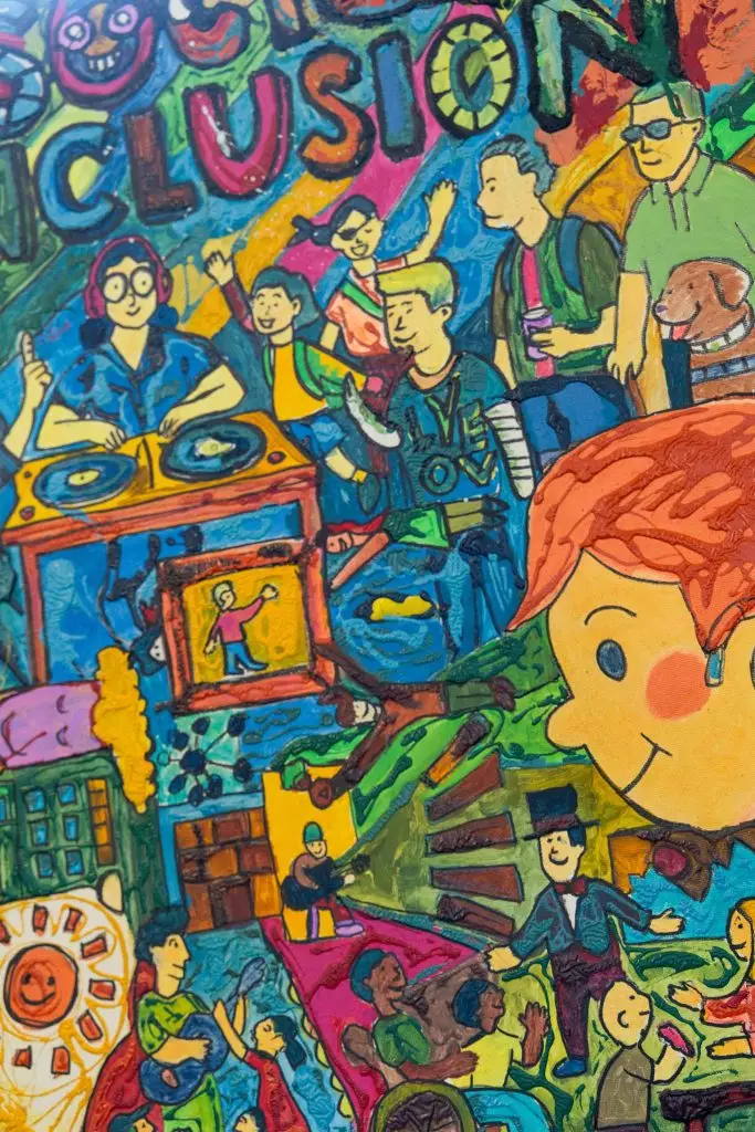 展覽主題圍繞三大核心:「共融社區」、「可持續生活」及「跨文化交流」,呈現香港的獨特面向與共融願景。當中藝術家包括患有自閉症及輕度智障的余祖堂Matthew,他不但充滿藝術天份,更是運動健將,曾於2013及2017年於特奧冬季世界賽速度滑冰獲得金牌。另一幅作品《異域同味》,則由土生土長的Ahmad Rida Nisar創作,Rida的父親是巴基斯坦人,母親是香港人,從小到大,她也有感自己要作為兩邊文化的橋樑:「共融在我來說,就是大家坐底,互相問下問題,飲啖茶,食個包。與其著眼於彼此的不同,不如試下發掘大家的共通點。」所以Rida的作品,就是兩位巴基斯坦和中國女子一齊飲奶茶、笑著聊天,因為奶茶同樣是兩邊飲食文化中不可或缺的部分!人與人之間的連結,往往就是由一份簡單的共鳴開始。