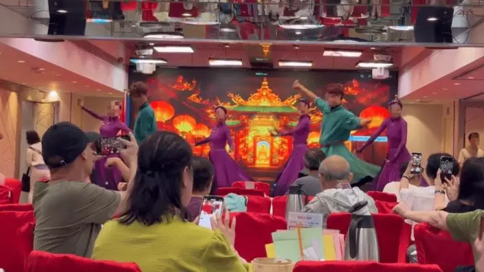 6名訪港旅客在觀塘恒生大酒樓表演蒙古舞蹈及雜技。 網上圖片
