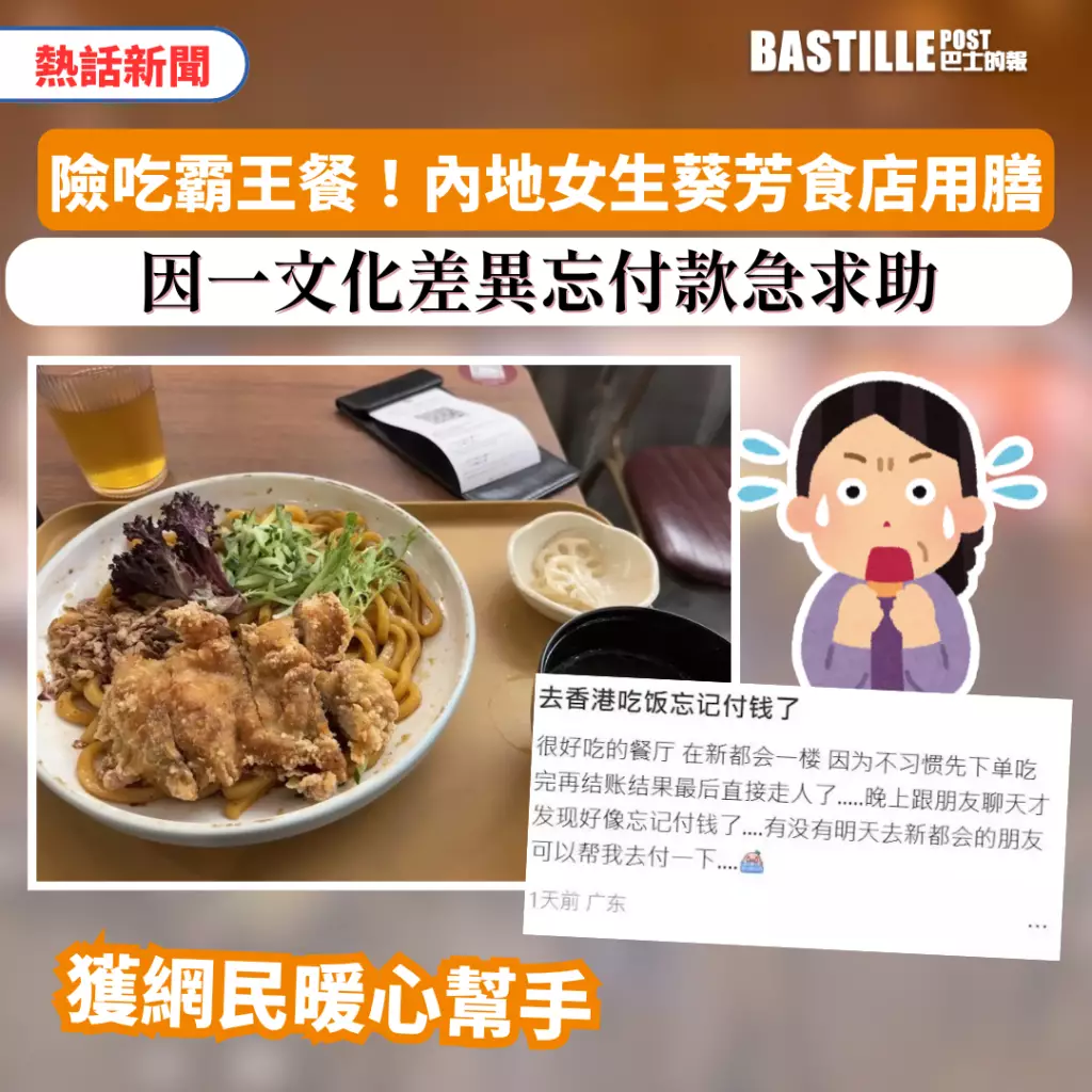 一內地女生在小紅書發文指,自己在葵芳一食店用膳後,因未習慣香港「先食後付」模式,竟未付款就離開,直至夜間與朋友聊天時才驚覺失誤,焦急發文求助:「有沒有明天去新都會的朋友,可以幫我去付一下……」