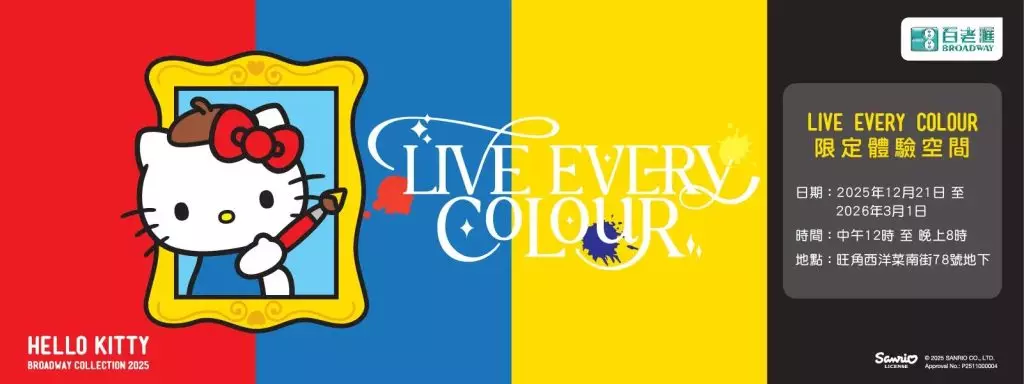今個冬天,百老滙聯乘 HELLO KITTY 推出全新「LIVE EVERY COLOUR」系列。為帶來更深刻、更多元的體驗,位於旺角西洋菜南街的百老滙分店將化身為 HELLO KITTY「LIVE EVERY COLOUR」期間限定體驗空間,邀請大家走進由色彩編織而成的繽紛世界,發掘屬於自己的色彩個性。