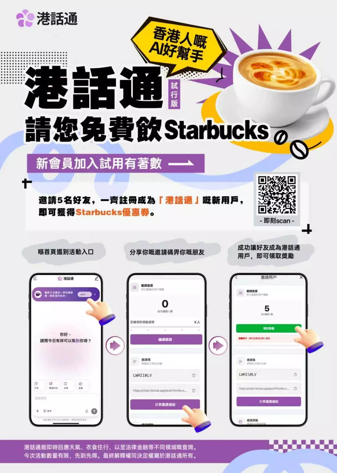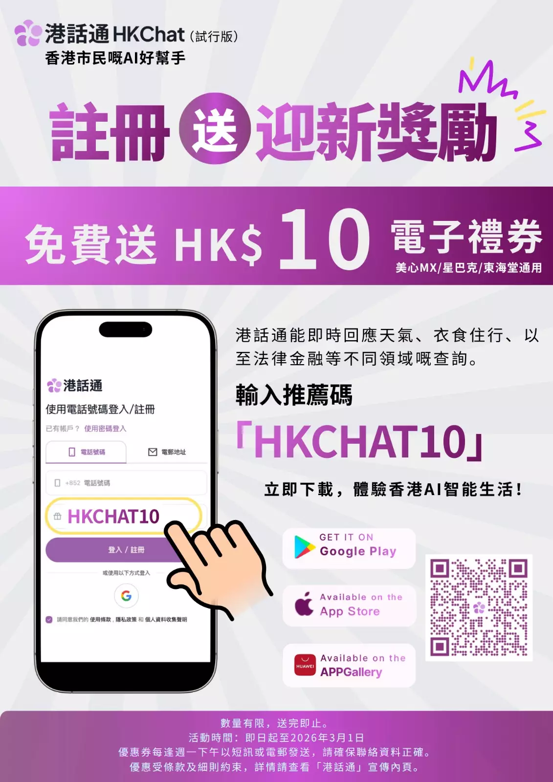 為答謝公眾支持,「港話通」試行版推出全新用戶專屬優惠。即日起至2026年3月1日,新用戶只需掃描指定二維碼下載應用程式,並於註冊時輸入推薦碼「HKCHAT10」,即可獲取價值港幣10元的無門檻電子禮券,適用於美心MX、星巴克、東海堂等商戶。禮券將於每周一下午透過已登記的電郵或手機短訊發放,有效期至2026年3月31日,數量有限,送完即止。