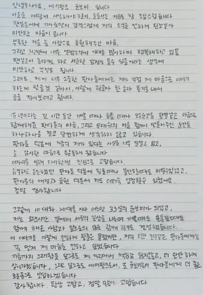 普美還對粉絲可能因媒體報道先得知消息而感到驚訝或失望表示歉意,她回顧出道15年來的點點滴滴:「多虧了可靠又溫暖的Panda們,我才能在辛苦或不安時撐過來,更加成長。」普美的親筆信讓許多粉絲大受感動,紛紛留言送上祝福。
