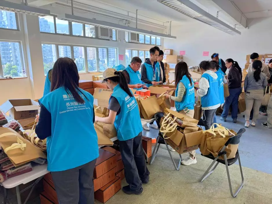 義工將物資製成福袋,盛載着社會對宏福苑居民的心意。民青局FB圖片