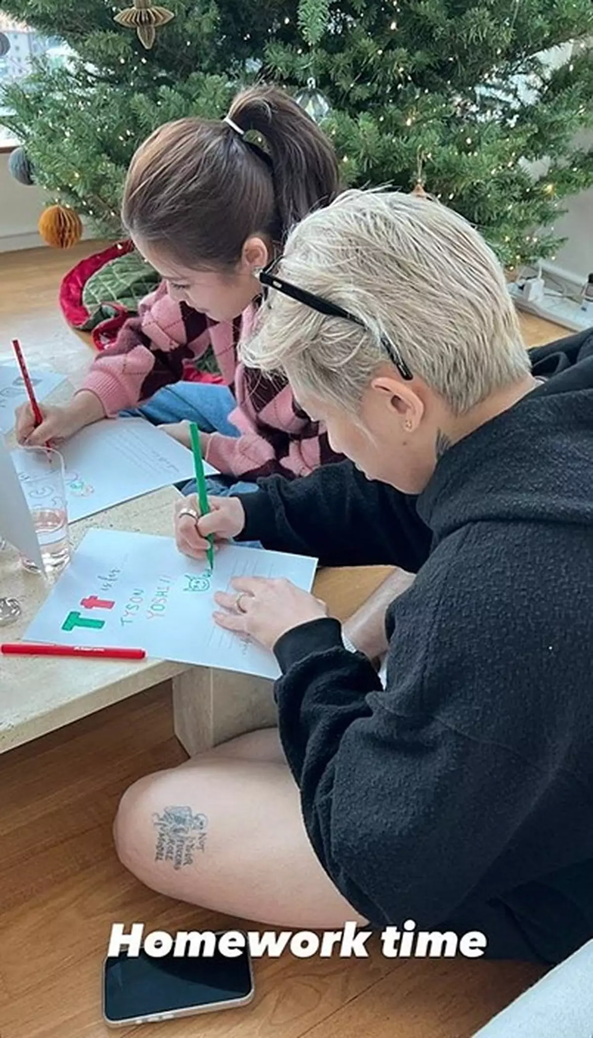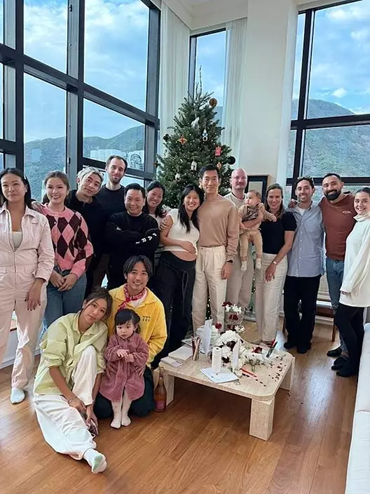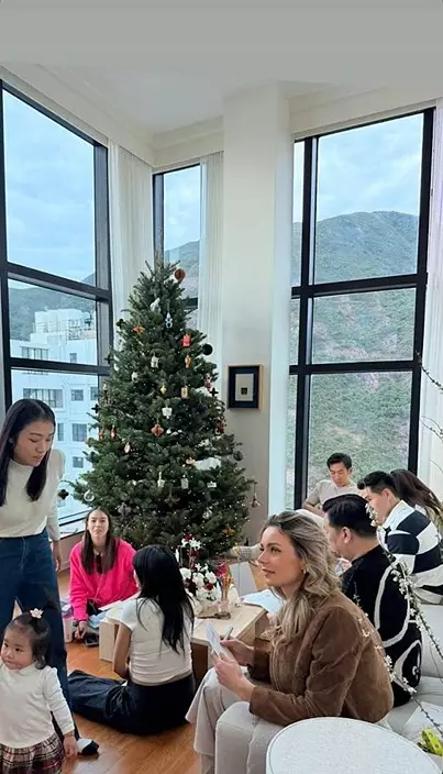 鄭瑤與老公Jacob邀請多位親友到家中聚會,包括細妹鄭珉(Amanda)、Tyson Yoshi與太太Christy,以及林德信一家等,場面溫馨熱鬧。從相片可見,派對佈置走簡約路線,客廳空間相當闊落,特高樓底氣派十足,猶如小型宴會廳。長形木餐桌上擺放紅白色康乃馨及精緻蛋糕小食,另一邊設有梳化及茶几,角落更放置了一棵聖誕樹,配合大幅落地玻璃,採光充足,整體感覺舒適又有品味。