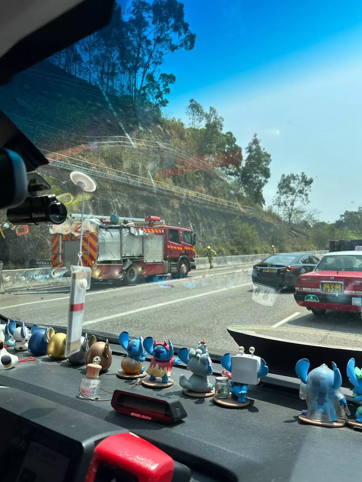 網上流出的影片及相片所見,貨櫃車車頭擋風玻璃爆裂,貨櫃變形,碎片散落一地並出現漏油;消防車車尾損毀。