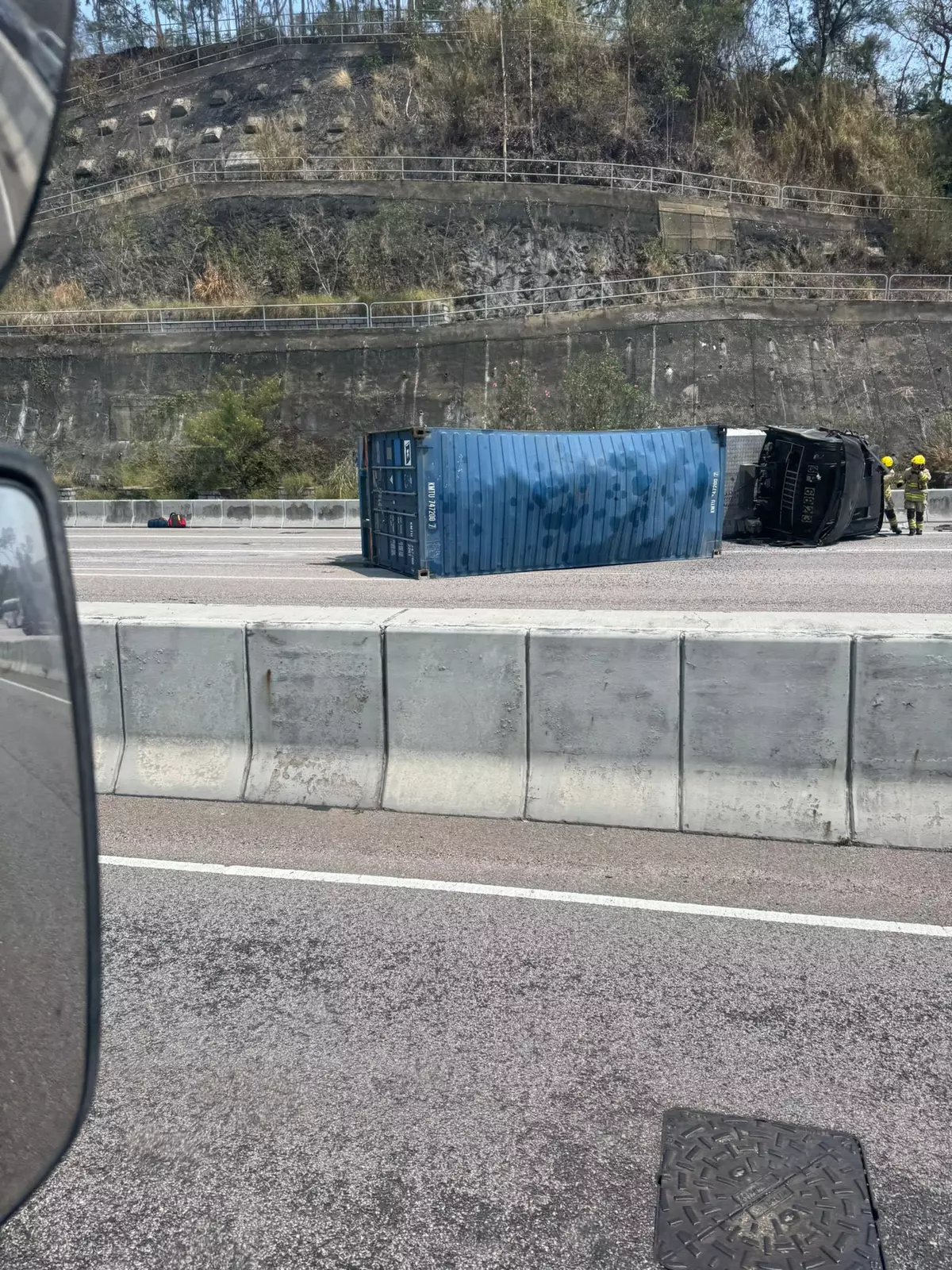 中午12時15分,一輛貨櫃車沿屯門公路往九龍方向行駛,駛至近掃管笏屯門鄉稔灣村公所對開時,與一輛消防車相撞。貨櫃車翻側路中,司機昏迷一度被困,其後被救出送往屯門醫院搶救。