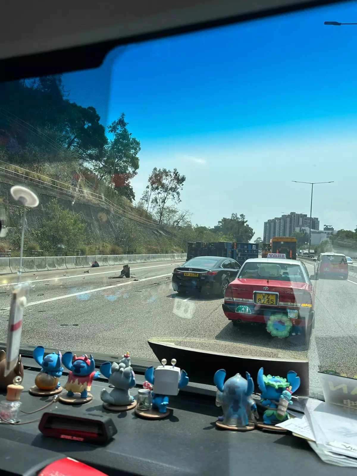 受事故影響,屯門公路出九龍方向近掃管笏部分行車線封閉,交通擠塞,車龍延至屯門三聖邨。