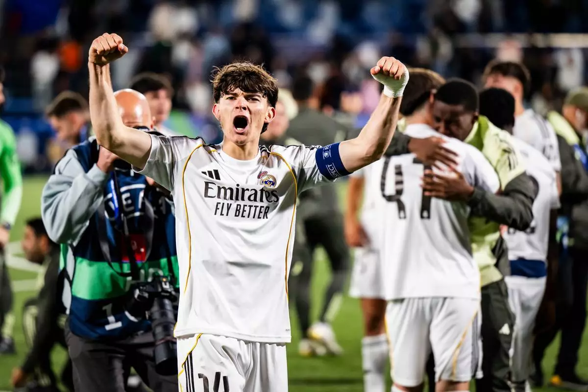 2026年4月20日周一,皇家馬德里球員卡路士迪亞斯在瑞士洛桑舉行的布魯日對皇家馬德里青年聯賽決賽中慶祝勝利。(美聯社圖片/Jean-Christophe Bott/Keystone) AP圖片