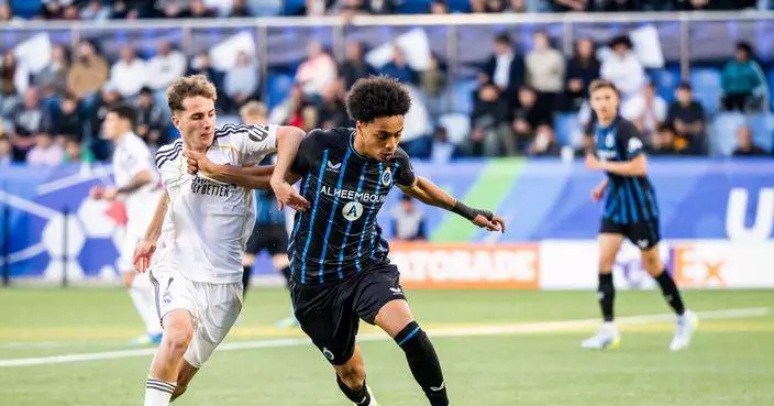 2026年4月20日周一,皇家馬德里球員丹尼爾耶尼斯(左)與布魯日球員安德烈加西亞(右)在瑞士洛桑舉行的歐洲青年聯賽決賽中爭奪控球權。 (美聯社圖片/Jean-Christophe Bott/Keystone) AP圖片