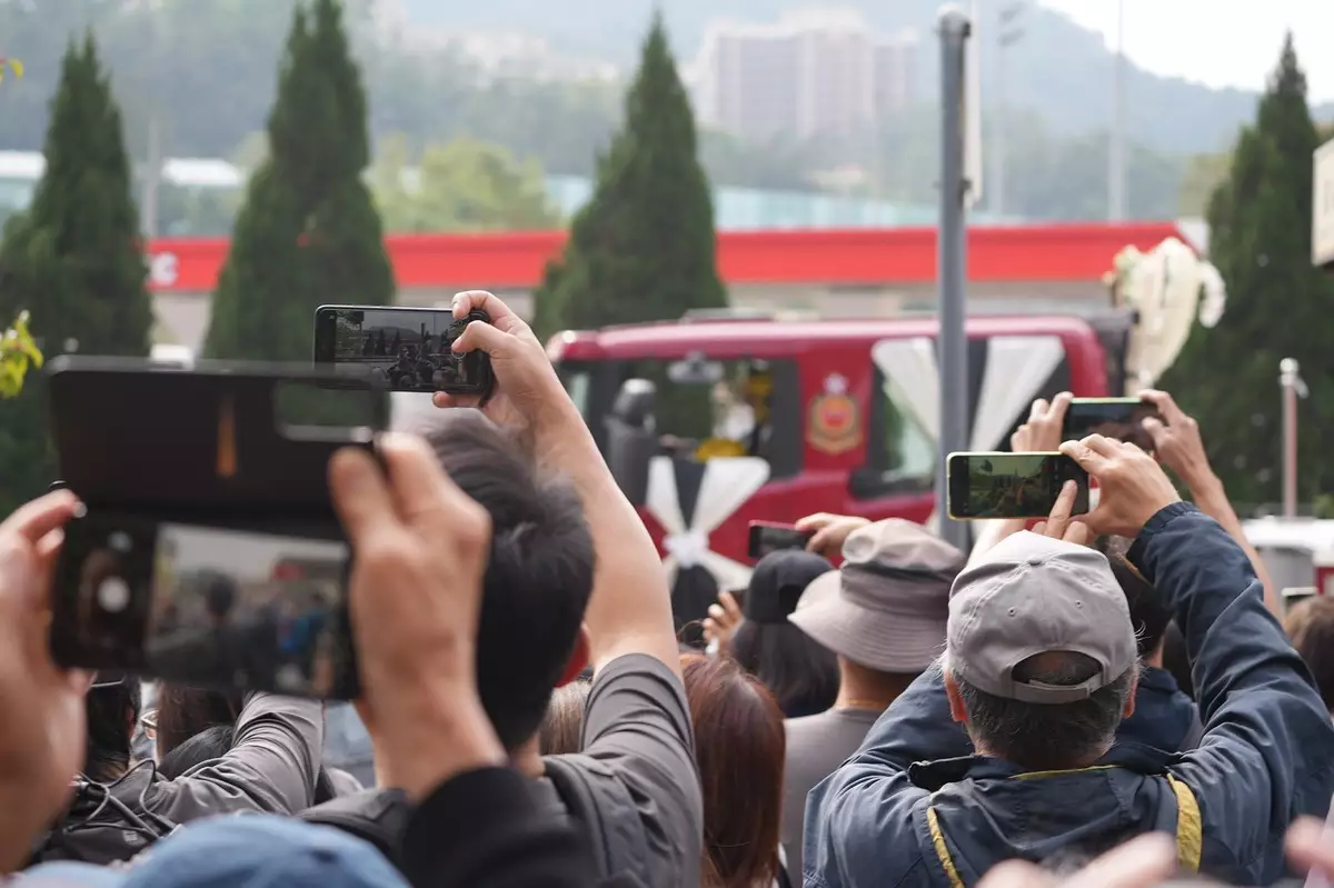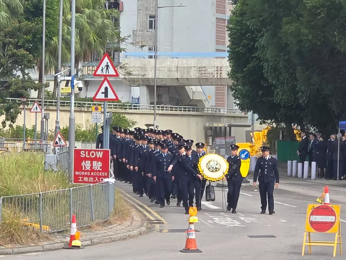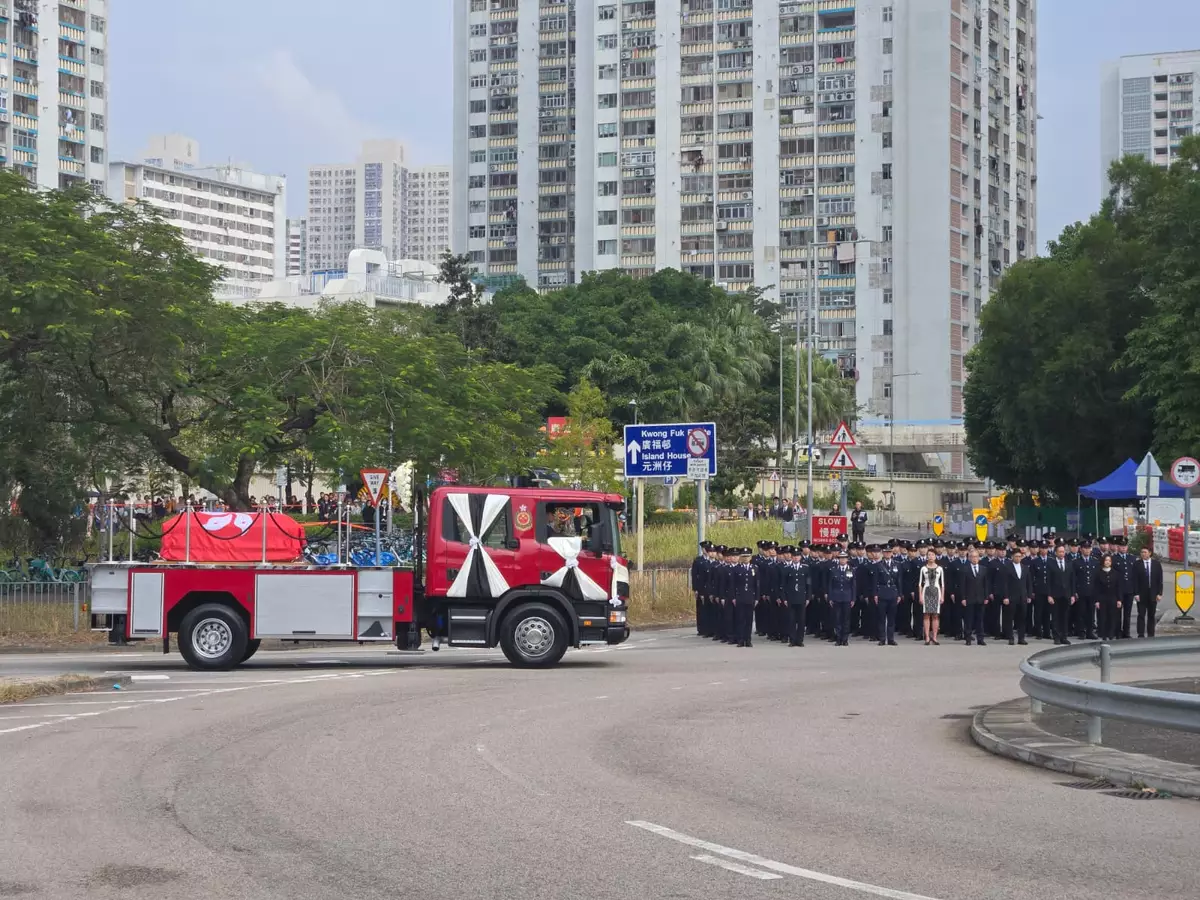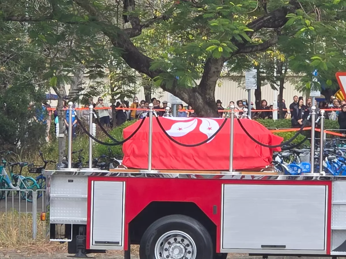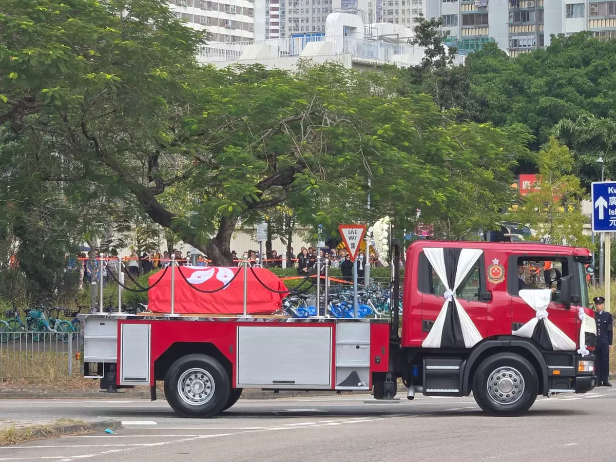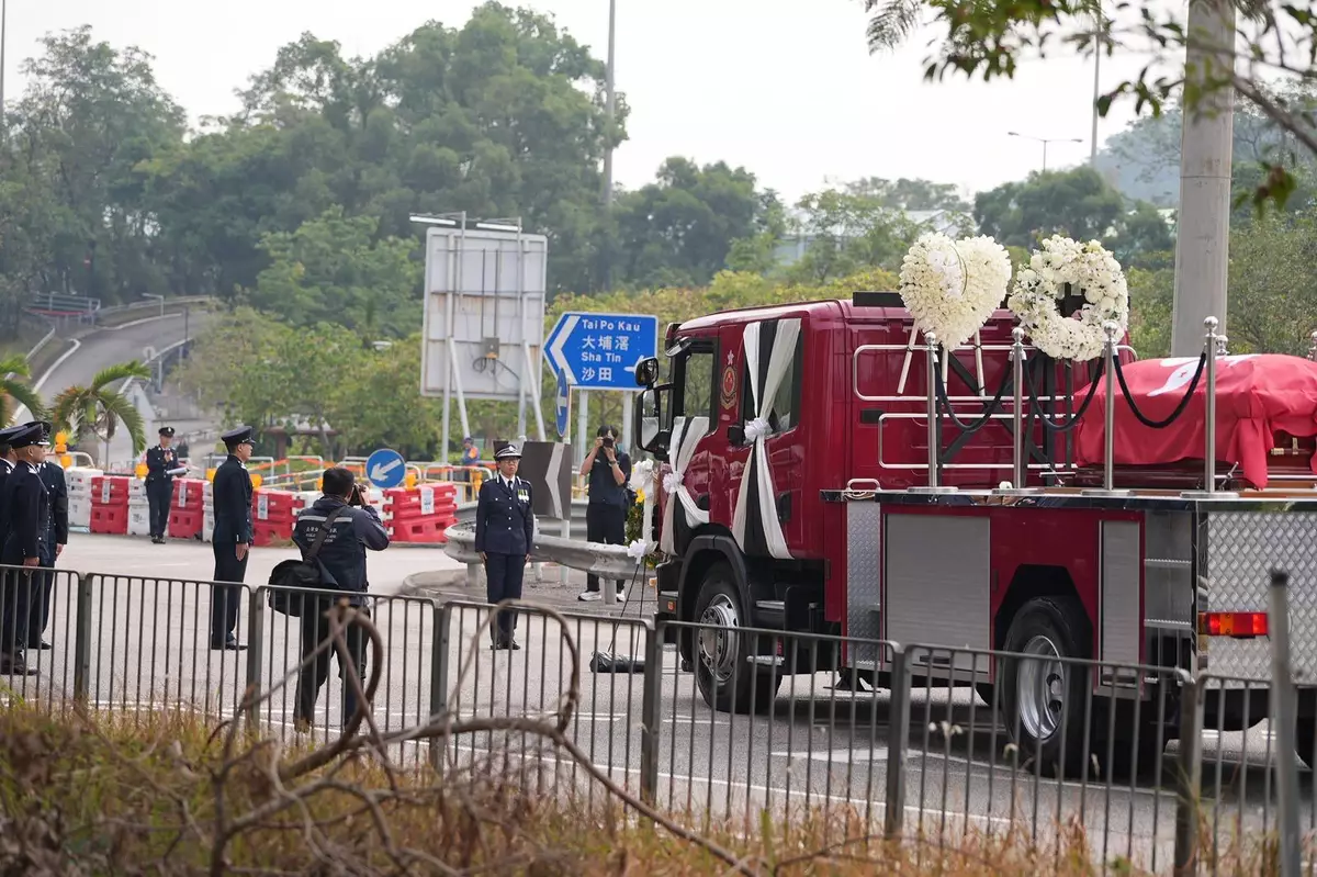 大埔宏福苑火災殉職的消防隊目(追授)何偉豪今日(12月19日)出殯,早上在世界殯儀館舉行最高榮譽喪禮後,靈車及車隊駛往大埔宏福苑路祭,消防同袍在場向他進行最後致意,不少市民亦帶備鮮花,送別這位救火英雄。