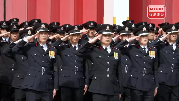 楊恩健帶領同袍在消防局外列隊,向何偉豪作最後敬禮。(游樹榮攝)