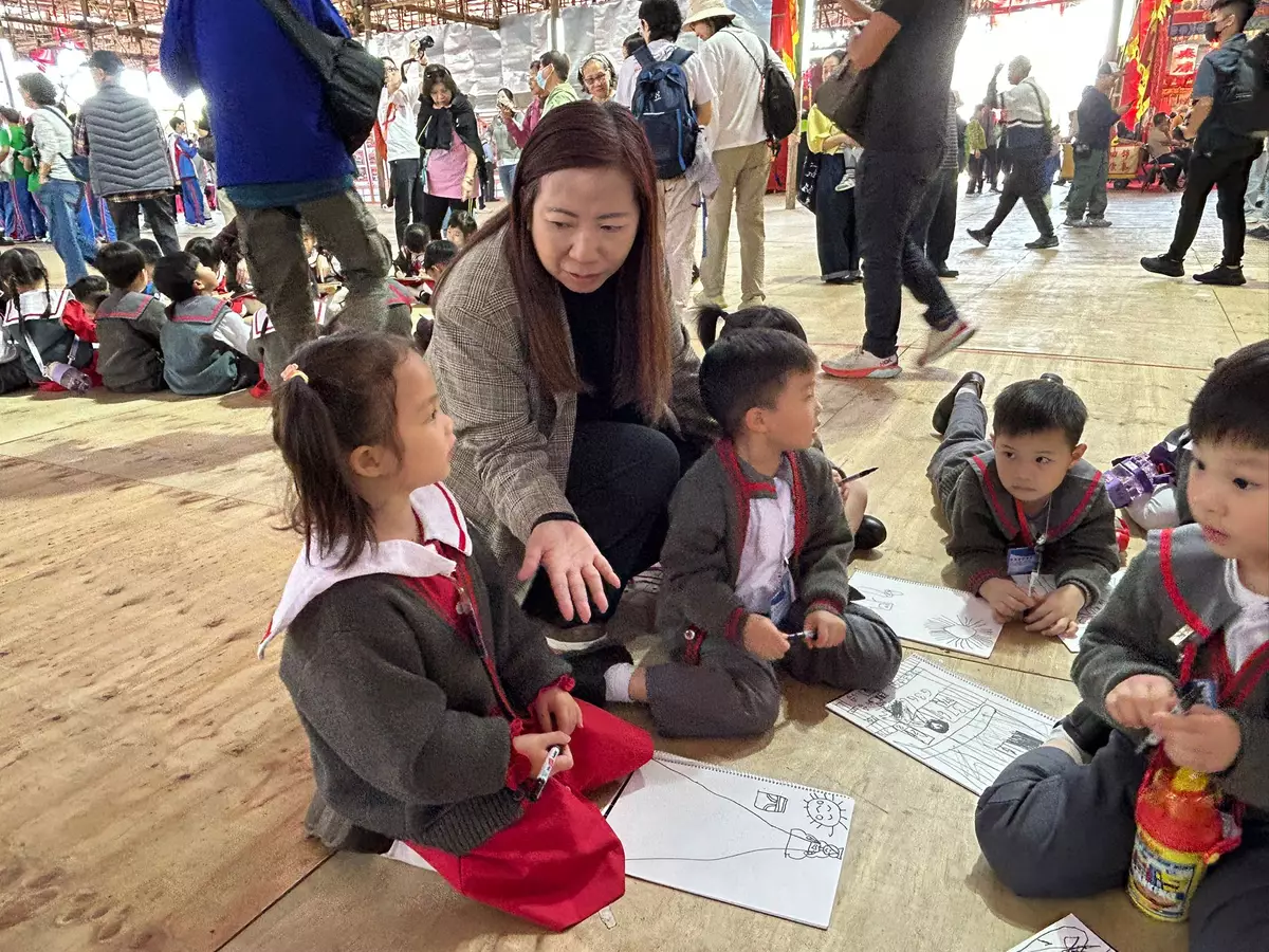 鄧校長在醮會現場與小朋友們互動交流。巴士的報記者攝
