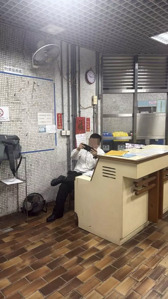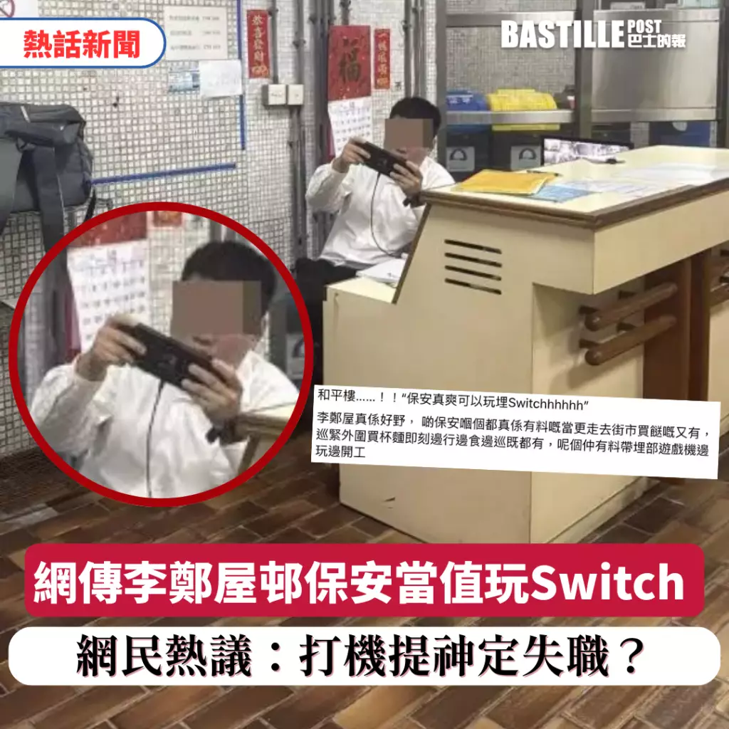 社交平台專頁「保安瞓覺名錄」近日流傳照片,指李鄭屋邨其中一座樓宇的男保安,在大堂當值期間公然遊玩任天堂Switch遊戲機。