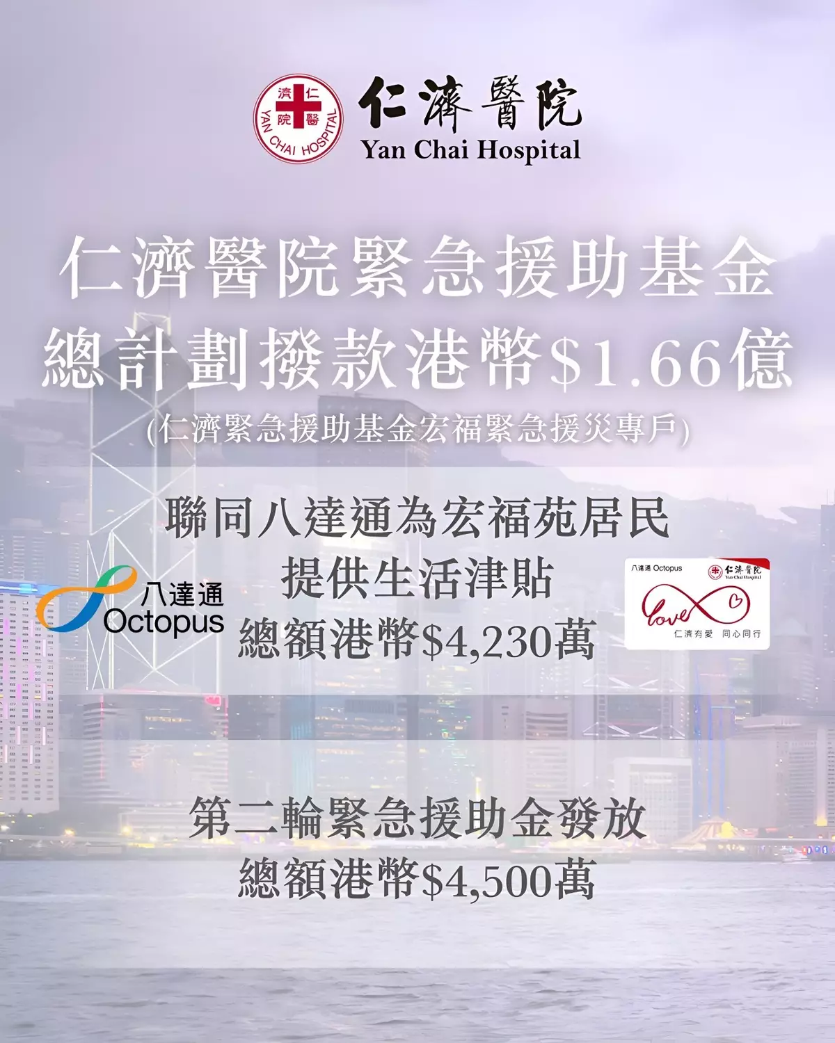 仁濟醫院宣布,撥出1億6600萬元援助大埔宏福苑居民,啟動一系列短期紓困與長遠重建計劃。仁濟醫院與八達通卡公司推出專屬八達通卡,向宏福苑居民每月發放生活津貼。