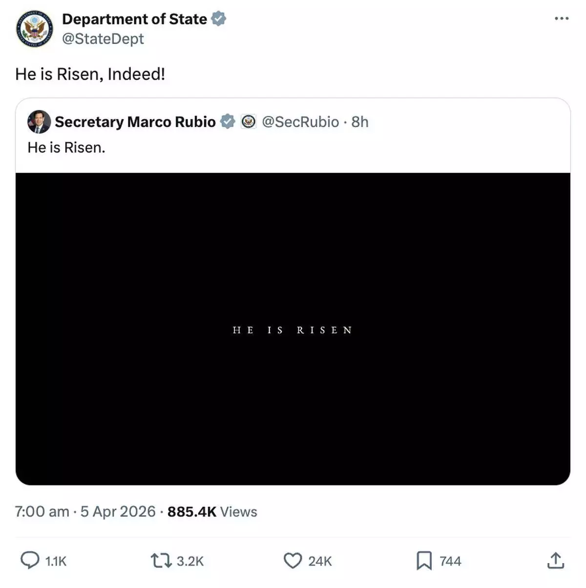這張截圖來自社交媒體X平台(X),顯示國務院(State Department)官方帳戶發布的復活節帖文。(美聯社圖片) AP圖片