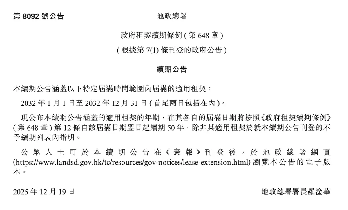 署方按照《條例》給予六年通知的要求,涵蓋2032年內到期而沒有續期權利的「一般用途地契」。有關的「續期公告」已上載至地政總署網頁。